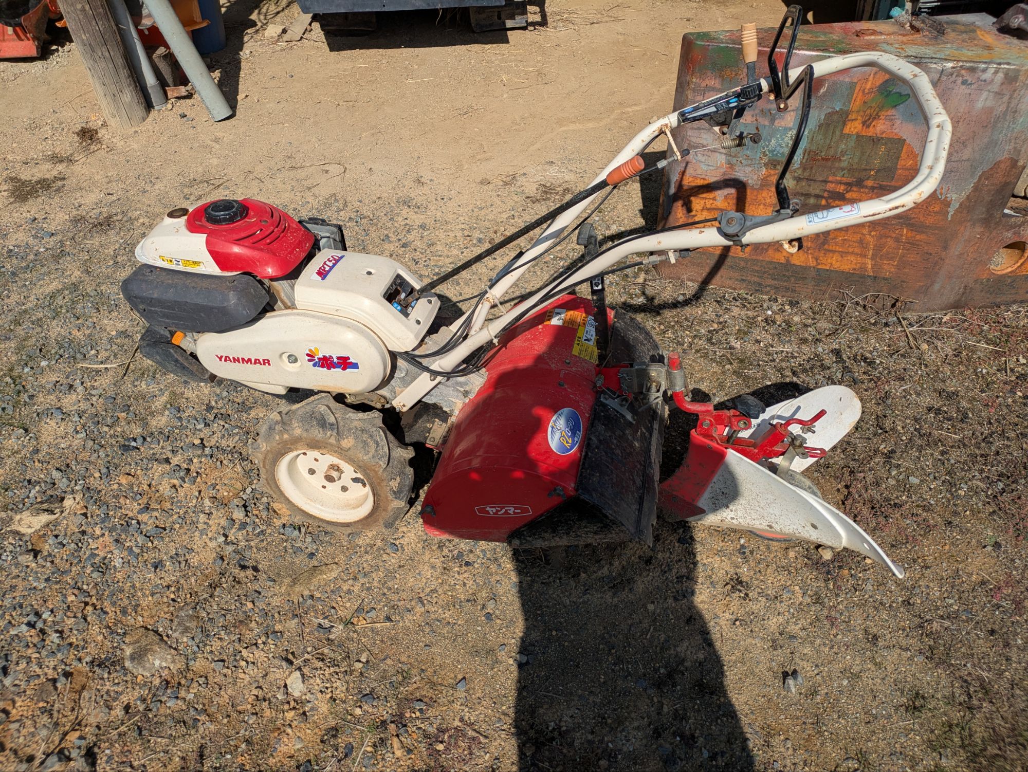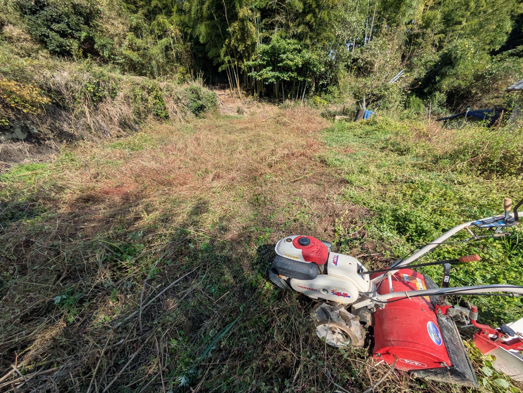 玉ねぎを植える畑の手入れをしていきます。この畑は春にジャガイモを植えたあと放置していたのですが、1シーズンで草木が生えすぎてました。なので、まずは草刈機で草を刈ってから耕運機で耕運をしています。