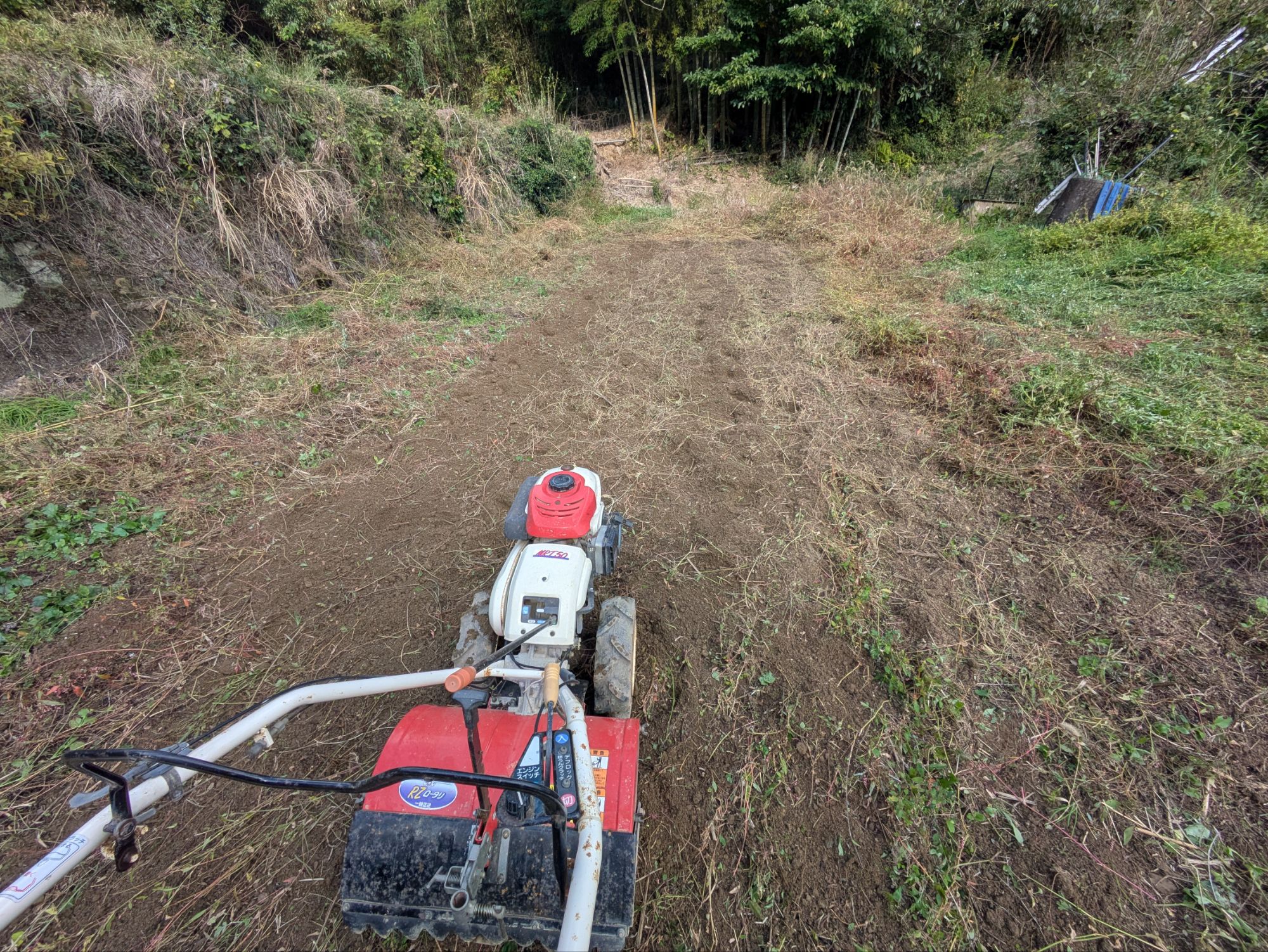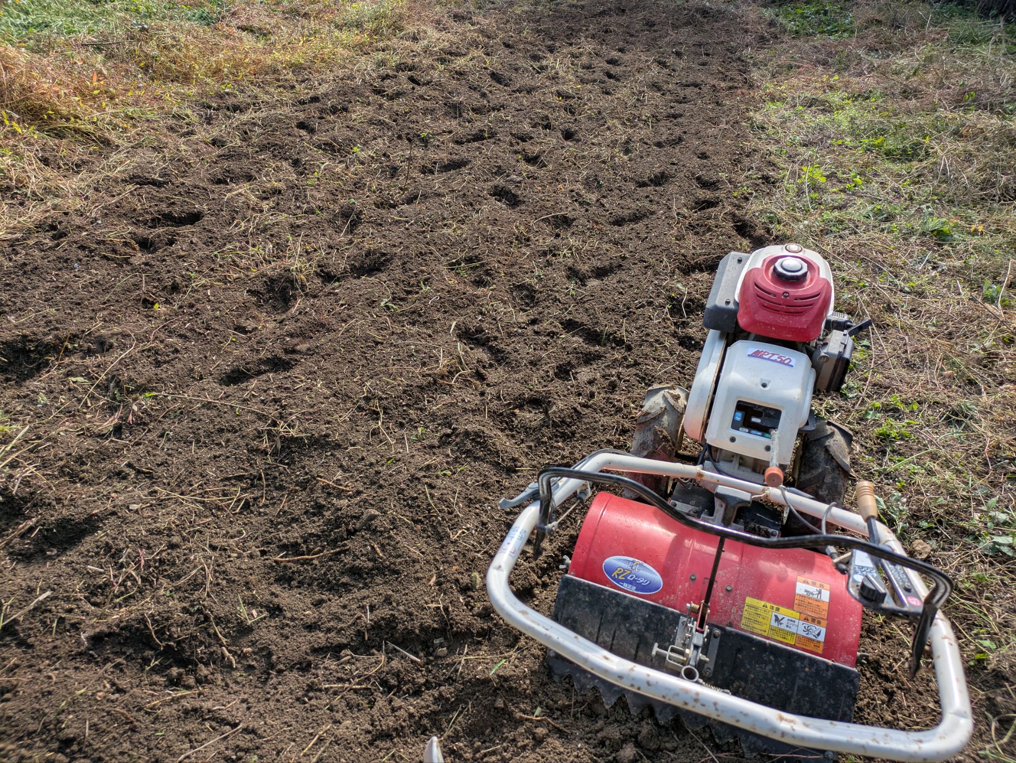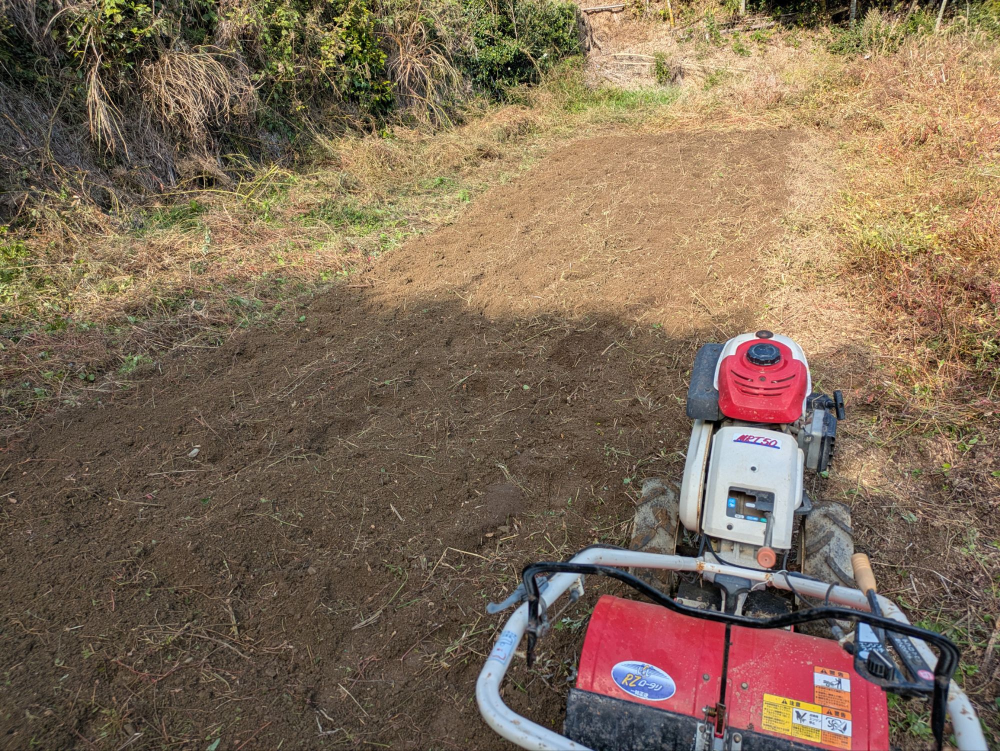 1回では上手く草木と土が混ざらなかったので何回も耕うんして固い土をほぐしていきます。