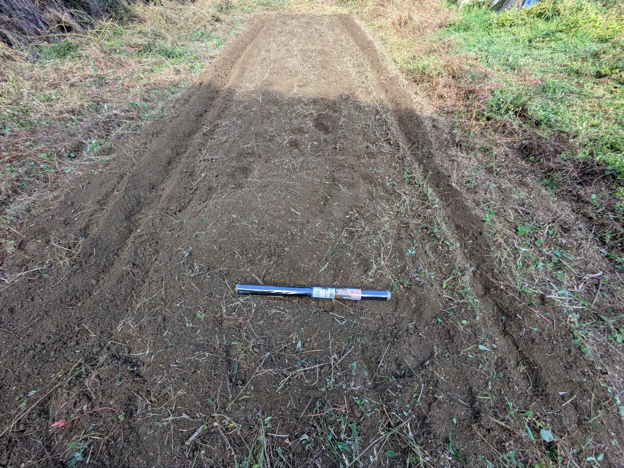 畝ができたところですが、買ってきたマルチと幅があっていないので、真ん中に溝を作って畝を2つにしました。