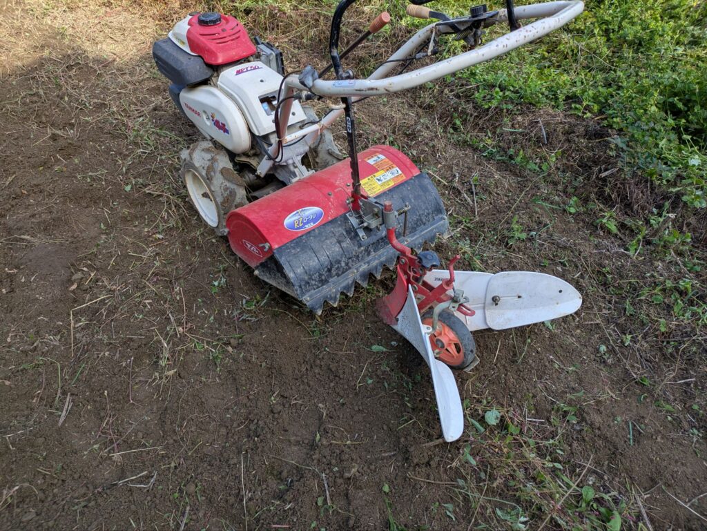 次に畝を作るため、耕運機にアタッチメントを取り付けます。