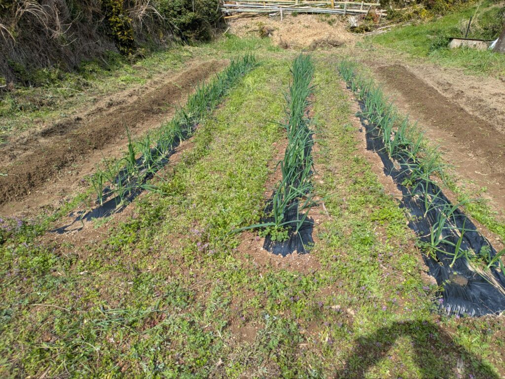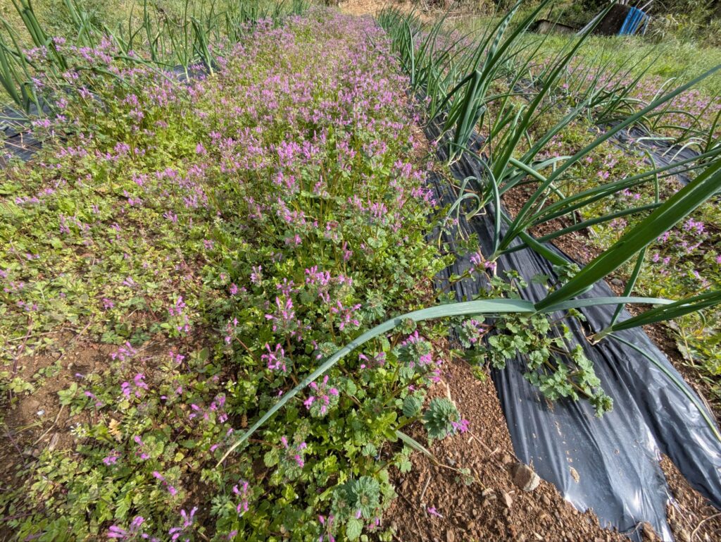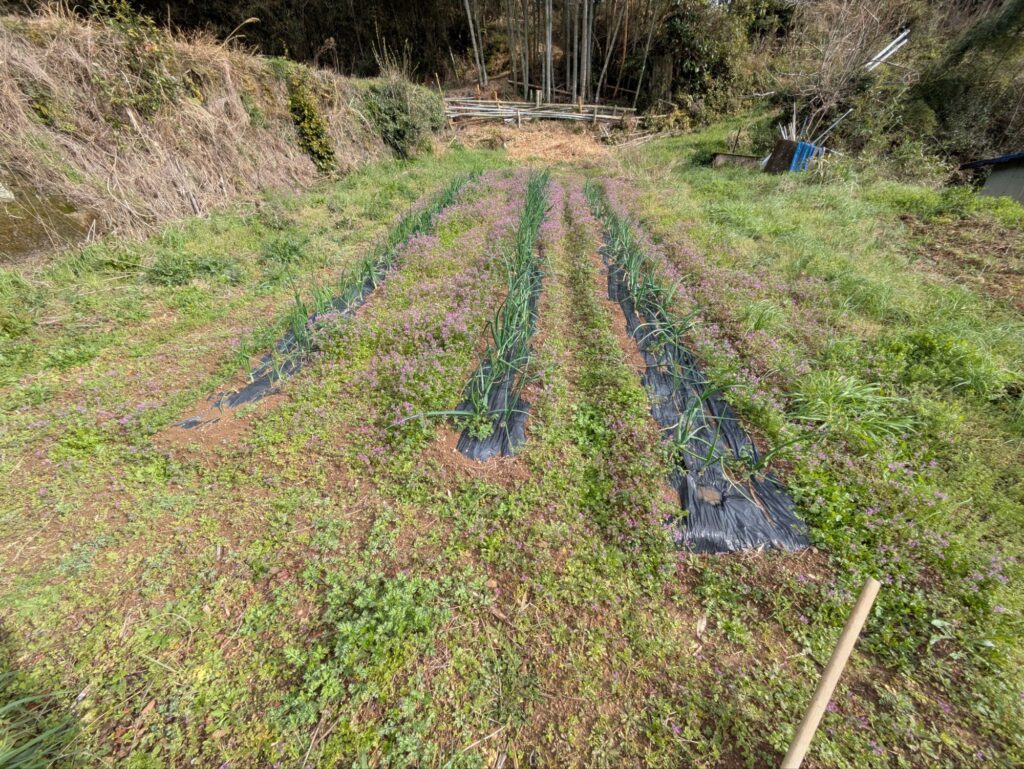 真冬の寒さを超えて暖かくなってきたからか、雑草の伸びが凄くなっています。特に畝と畝の間に生えている紫色の雑草「ホトケノザ」がグングン育っています。