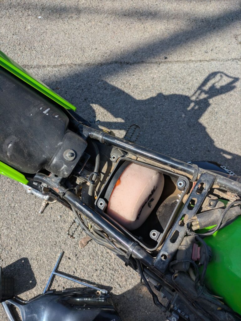 途中でエンジンが止まったのでエアクリを外しているところ。なんかエアクリ外したほうが調子がよい。もしかしてと思って8Mと10MのソケットとTレンチ持ってきててよかった。