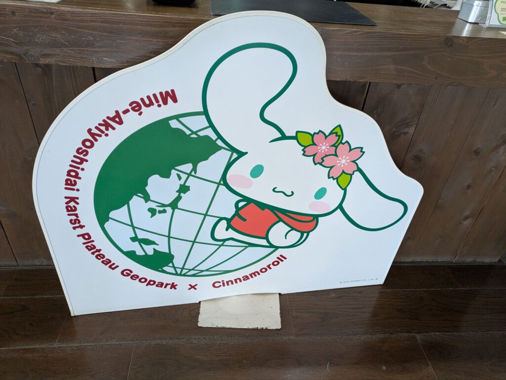 秋吉台の休憩スポットでシナモロールがいました。多くの方が「シナモンロール」と間違って覚えていることで有名?ですが、正式名称はシナモロールちゃんです。私が間違いを知ったのは日向坂46のまなふぃこと高瀬愛奈の発言から。