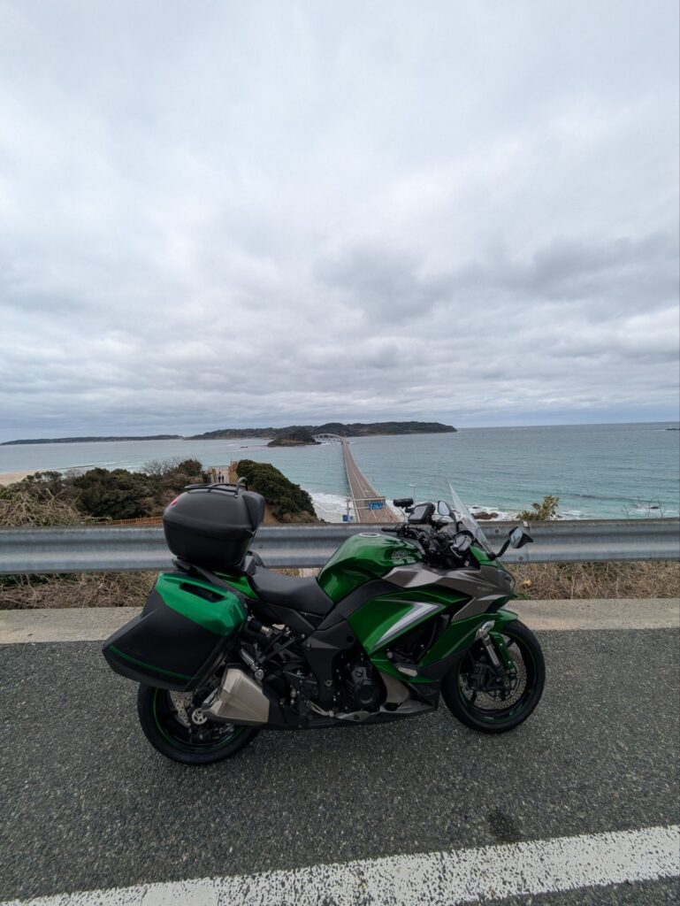 山口のツーリングスポットとして有名な角島大橋。日本一周ツーリング動画などでも良く紹介されてます。この日はあいにくの曇りですが、海に向かって進む橋は気持ちいいですね!