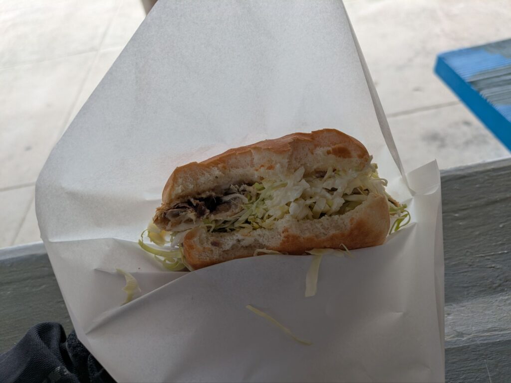 ただし、海風をモロに受けるので煽られないように注意してください。(関東で言えばアクアラインの千葉側、名古屋で言えば伊勢湾名港トリトン、関西で言えば四国との連絡橋のつもりで渡れば大丈夫かと)お昼は角島大橋のフィッシュバーガーを食べました。ゆっくり食べる予定でしたが、心変わりでこのまま別府まで行こうと思ったため早めに出るテイクアウトを選ぶことに。