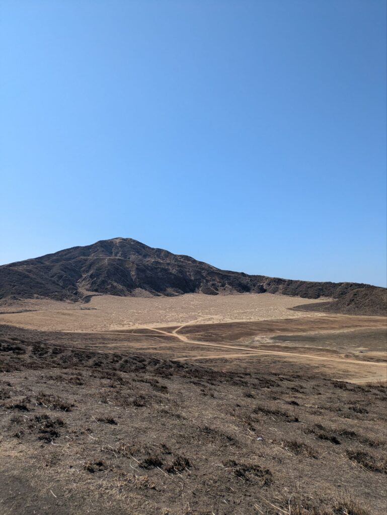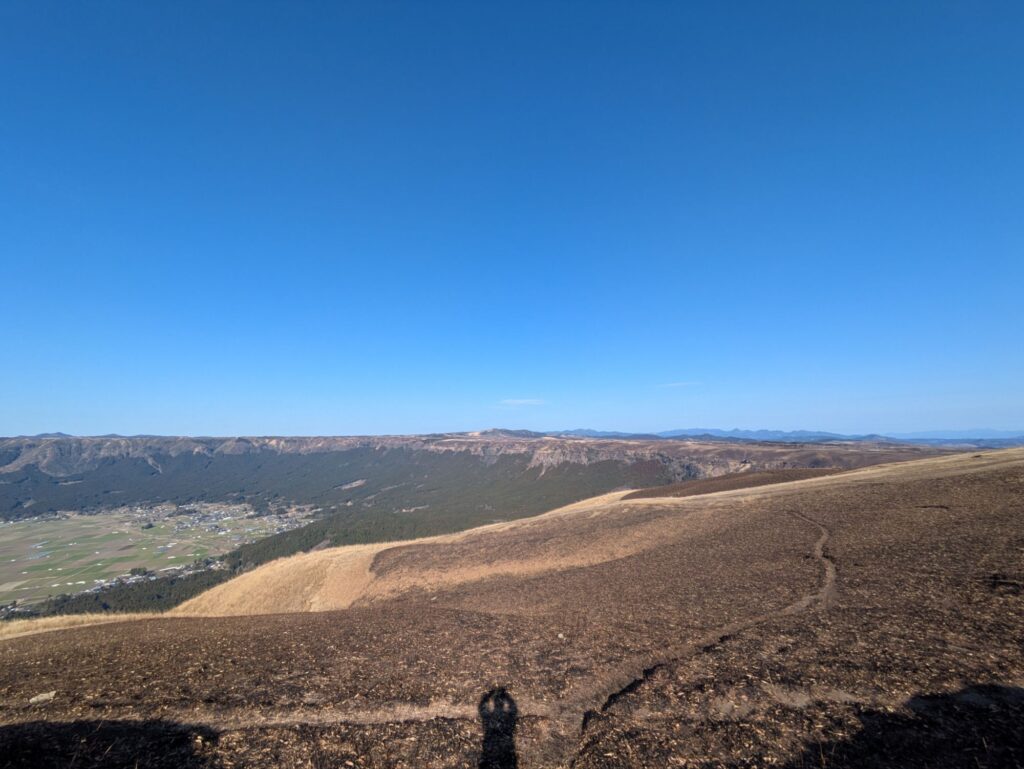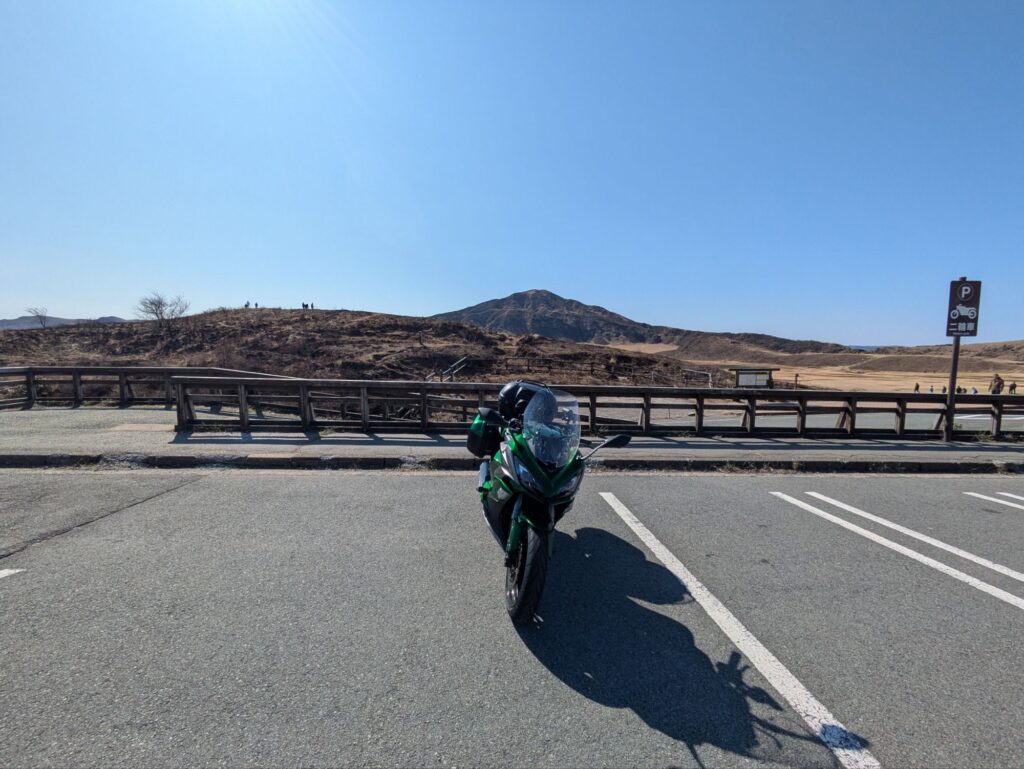 草千里から歩いて阿蘇山周辺を歩くスポットがあります。ただ土なのと勾配があるのでライディングジャケットとか着たまま歩くのは結構大変、雰囲気だけ味わうために少し丘を歩いた程度にしました。