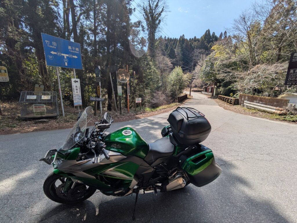 途中の県道41号線に入り山道を楽しんでいます。看板に「高千穂」が出ており興味が引かれまくってますが、時間が無いのでこの日はスルーして港に向かいます。