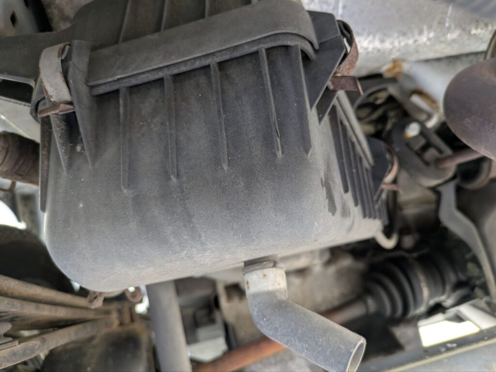 車体の後ろを見ると、写真のような黒い箱のようなものがあります。これがエアクリーナーボックスです。周囲が4つの金具で止められているので、順番に外していきます。
