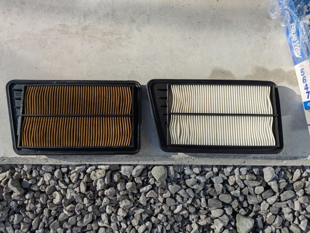 左側が古いエアクリーナー、右側が新品のエアクリーナーです。汚れているのが分かります。