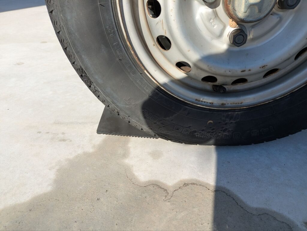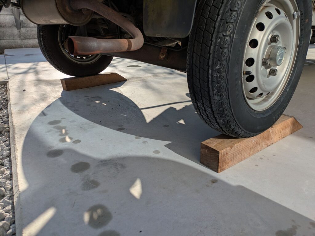 この際、前方に車が移動しないよう前輪に輪止めを掛けておきます。