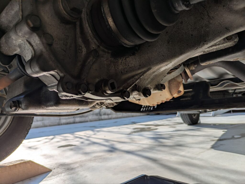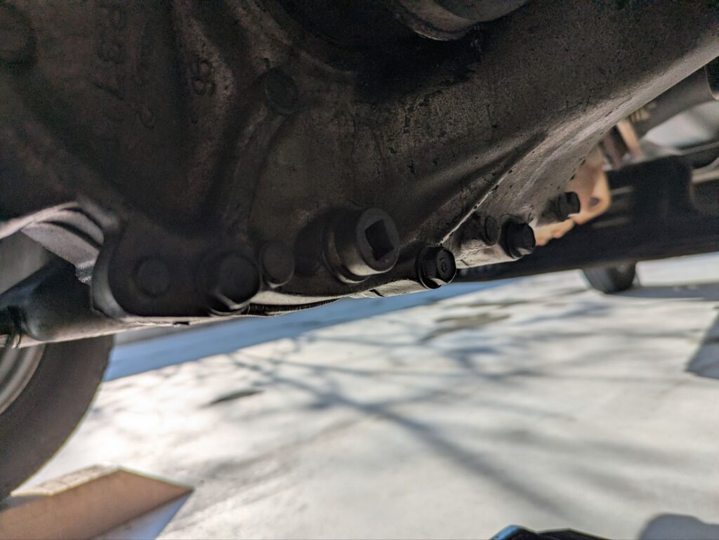 次にドレンボルトを外してミッションオイルを抜いていきます。ドレンボルトの形状が四角になっていますが、コチラは3/8sqのハンドルがピッタリ合うので使用してください。