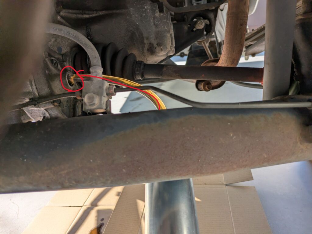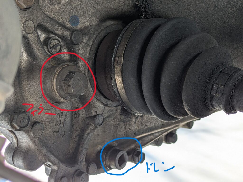 フィラーボルトとドレンボルトは右後輪のシャフトの根元にあります。