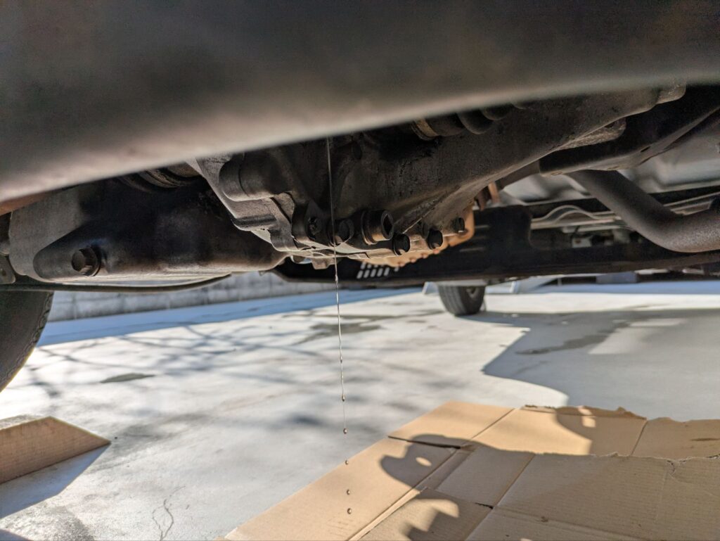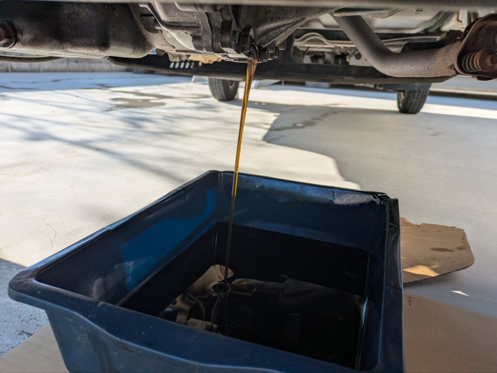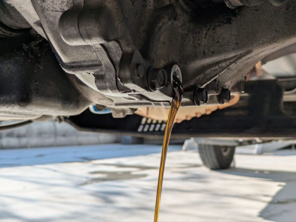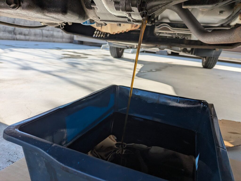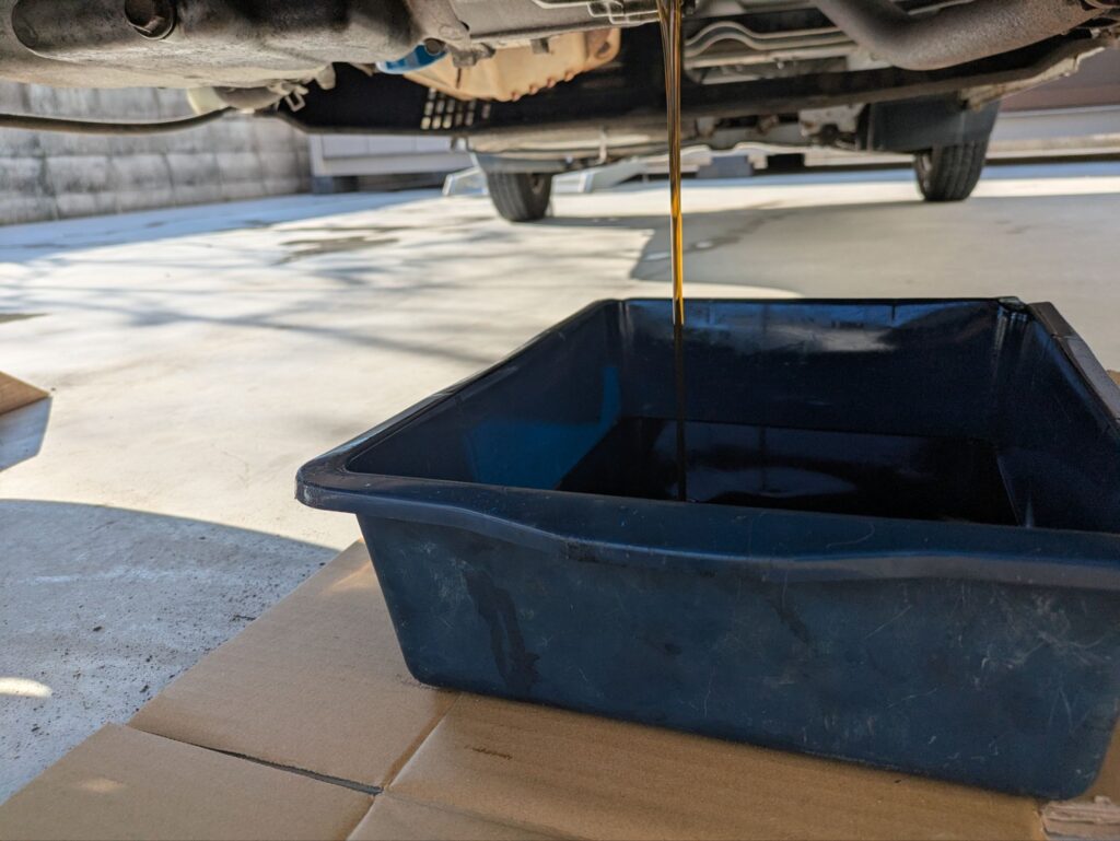 最後の方は勢いがなくなり、ドレンボルトの真下あたりに落ちてくるのでオイルパンが小さい場合は少し移動させておきましょう。