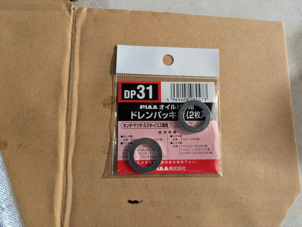 ドレンボルトのパッキンはエンジンオイルと同じサイズです。PIAAのDP31が使えます。
