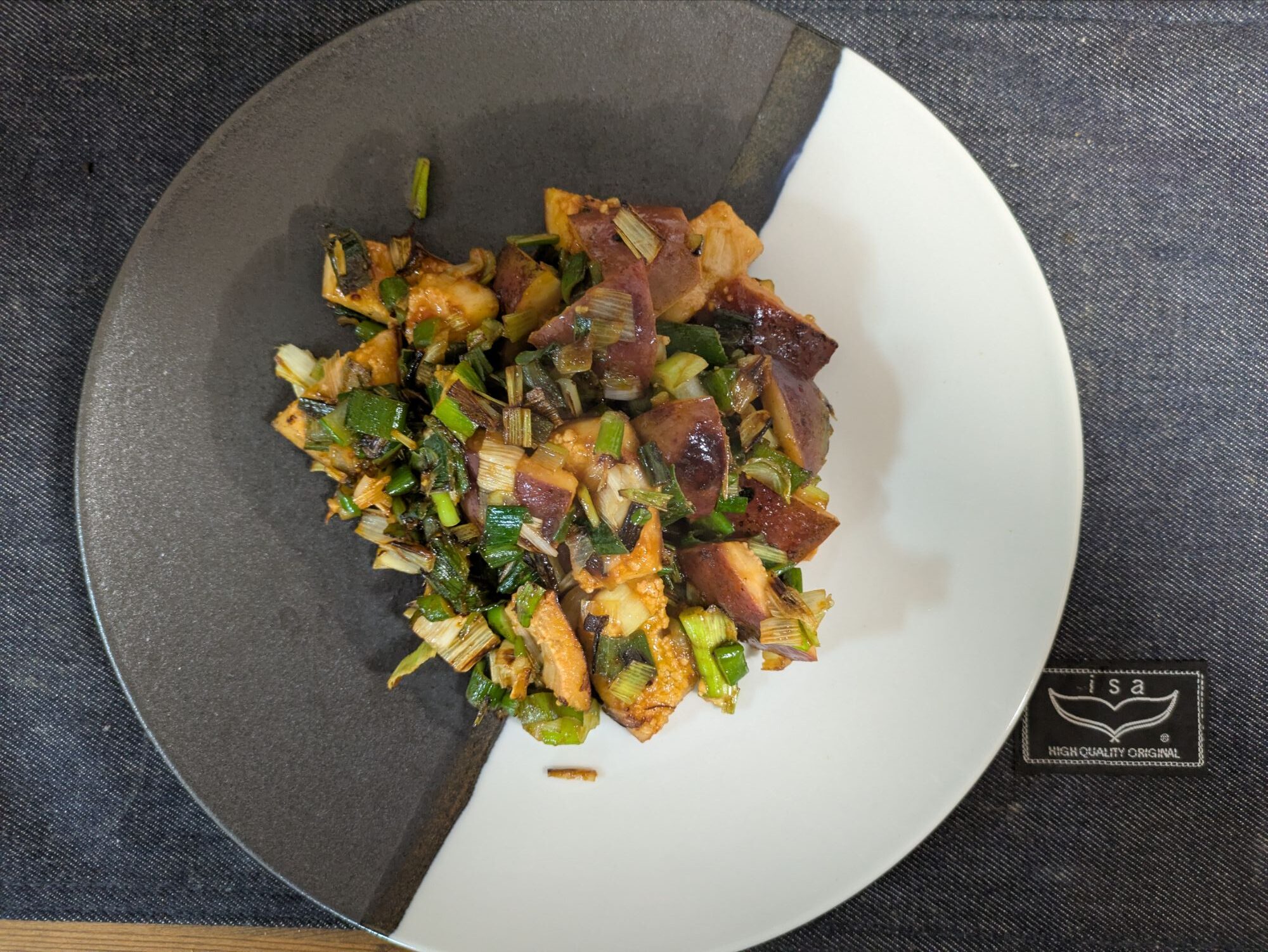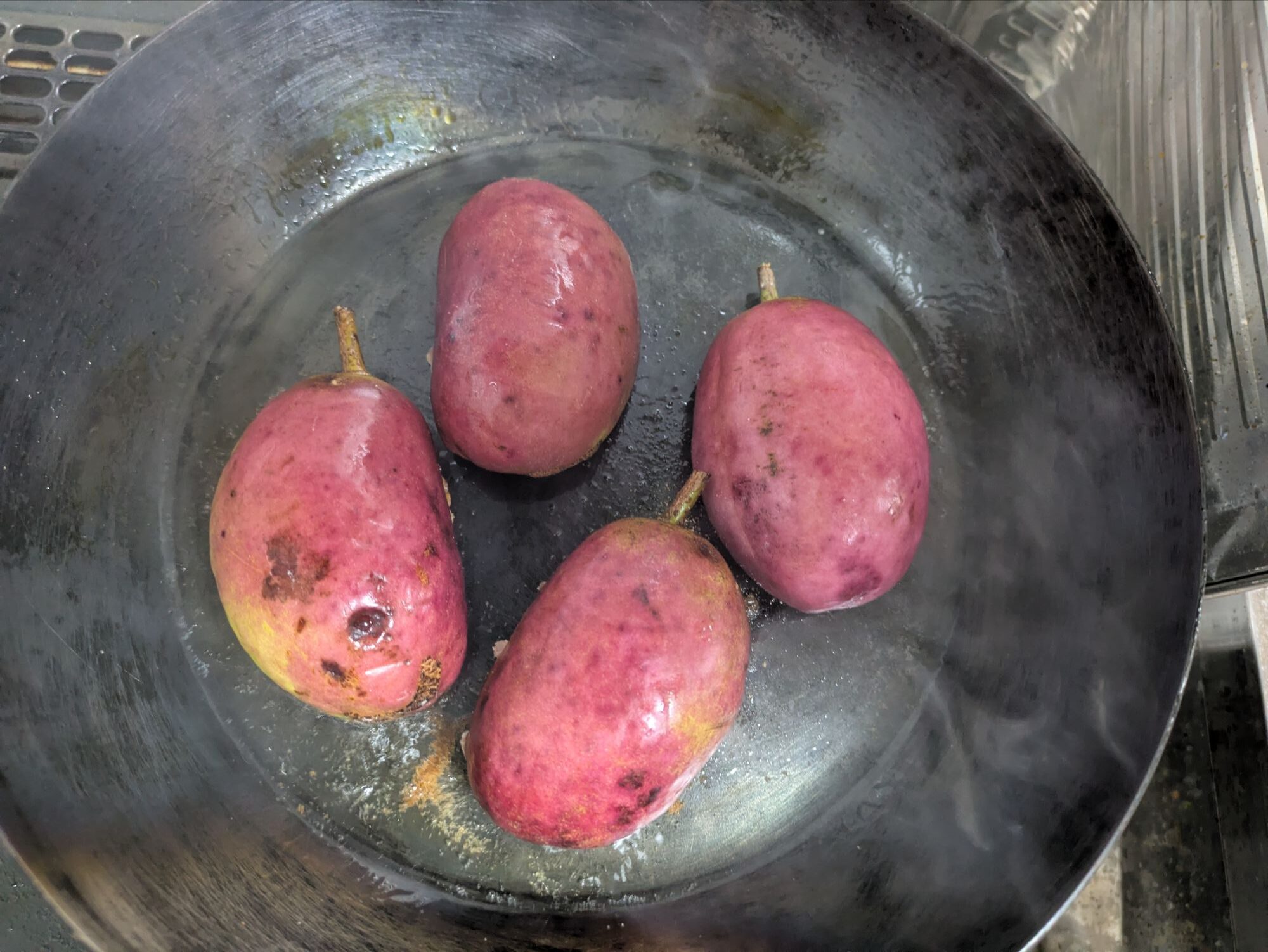 最初はアケビのサブジ風です。サブジはインドやパキスタンの家庭料理である野菜のスパイス炒めです。簡単に作ろうと思いカレー粉を使いました。