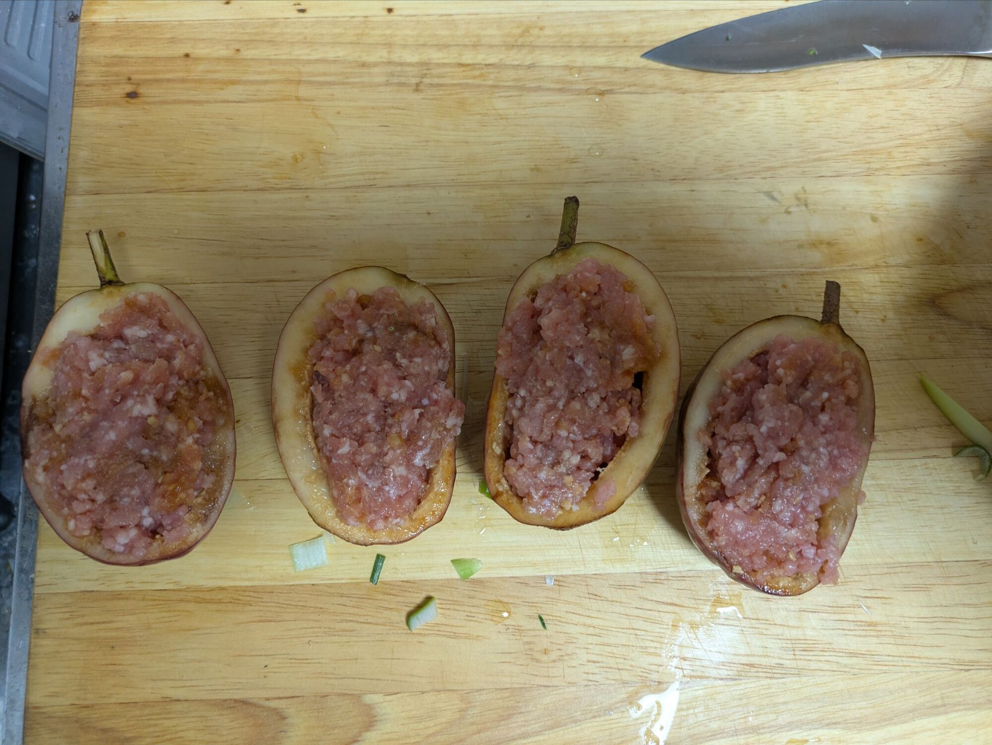 ピーマンの肉詰めを作る感覚と同じようにアケビの皮に肉詰めしていきます。