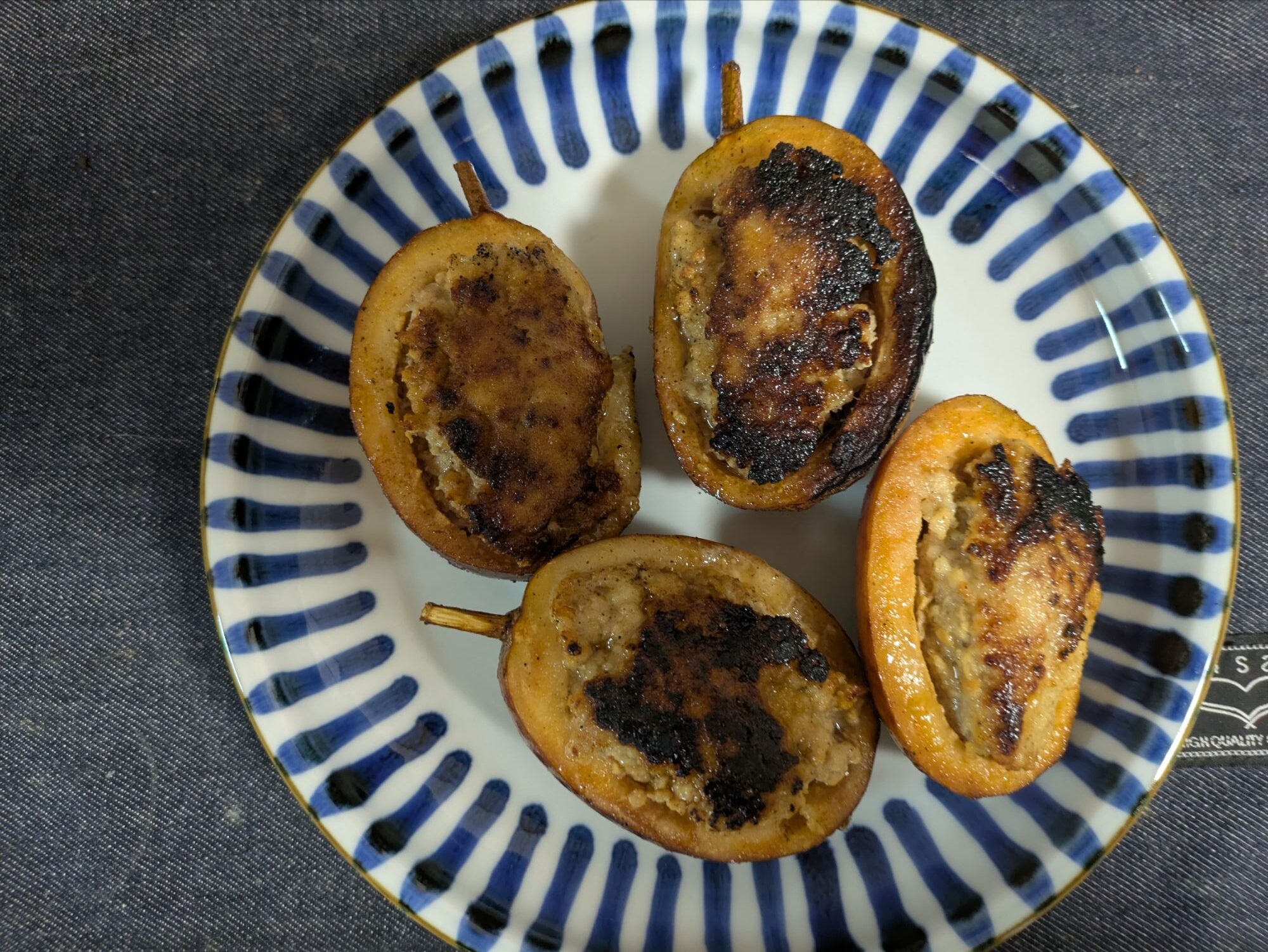 準備が出来たら熱したプライパンにアケビの肉詰めを置いていきます。