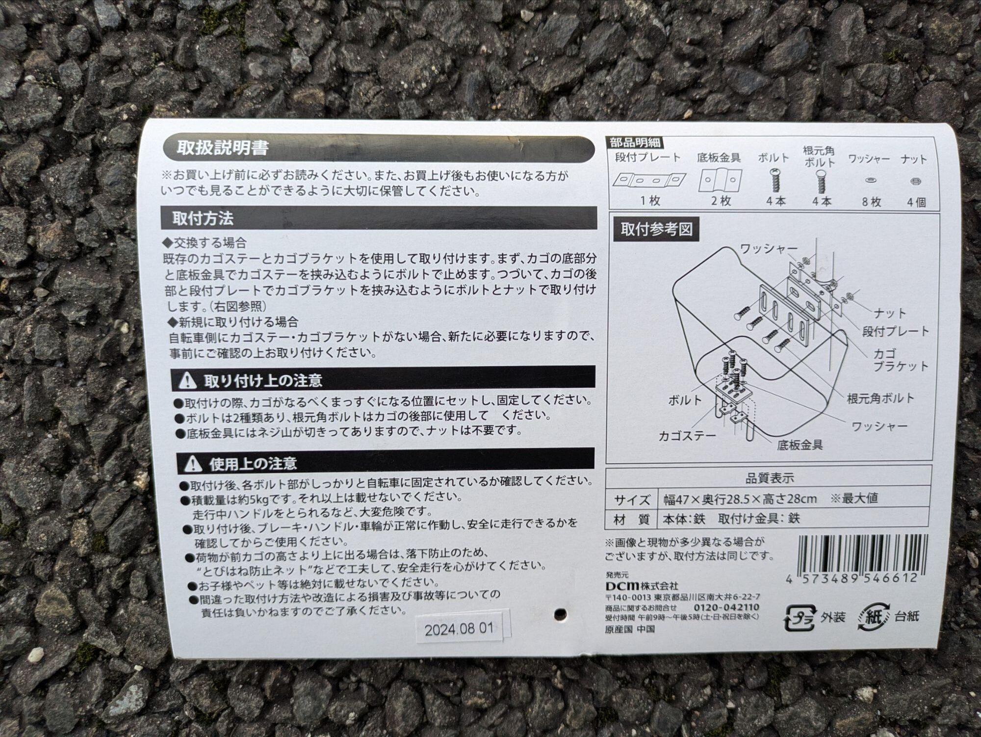 前かごの取り付けですが、大体工賃が300円とか400円とかスタバのコーヒー一杯程度なので、工具が無い方や時間がない方はホームセンターなどで一緒に取り付けてもらうのもアリだと思います。