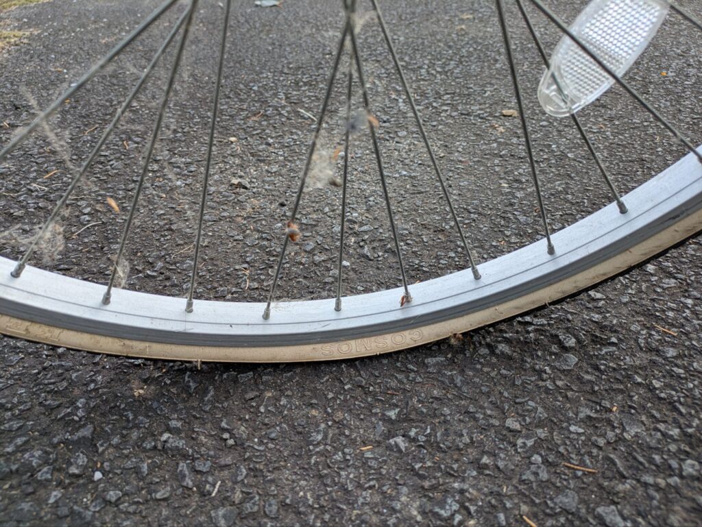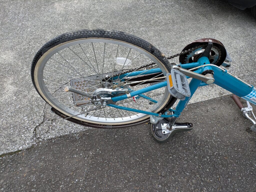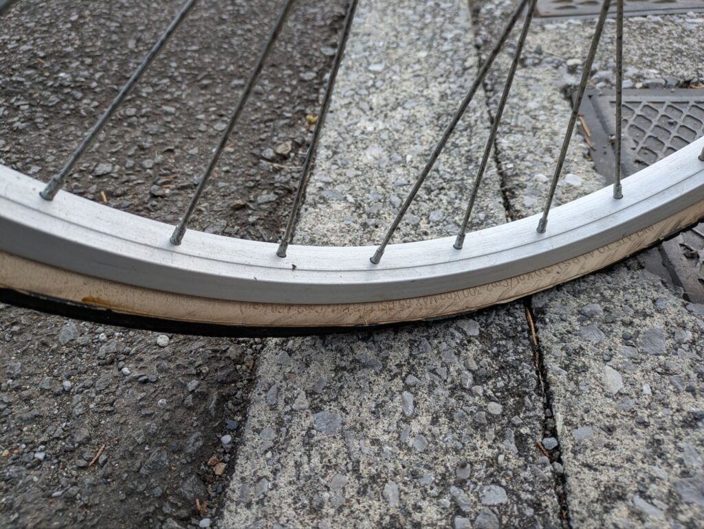 前輪、後輪ともに空気が完全に抜けており、タイヤがペチャンコになっています。
