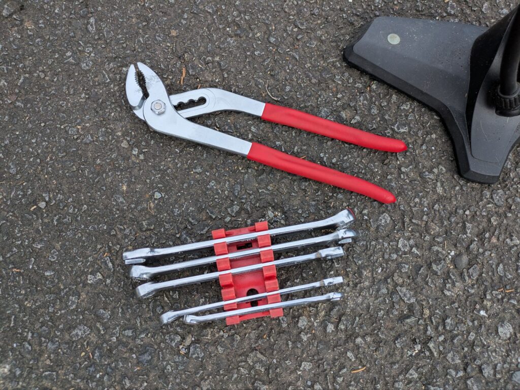 車やバイクを整備する道具で行ってますが、ホームセンターで売っている安い奴で十分ですので、最初から始める方はホームセンターで替えのチューブを買うついでに工具も揃えましょう。