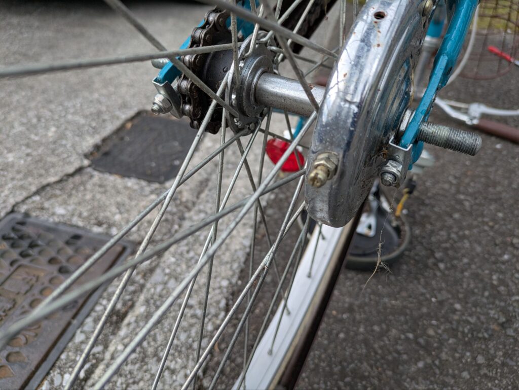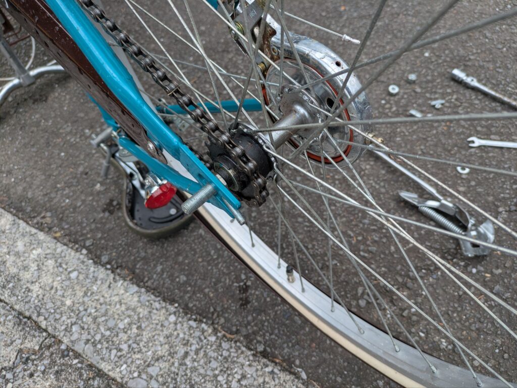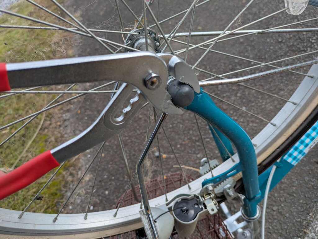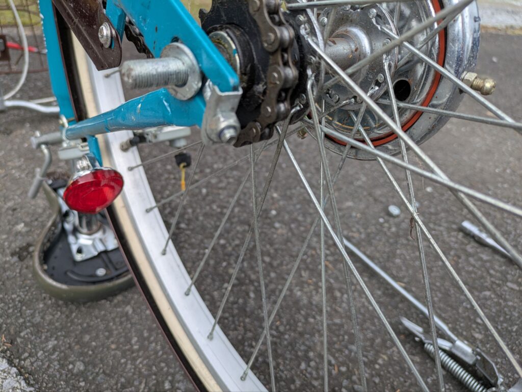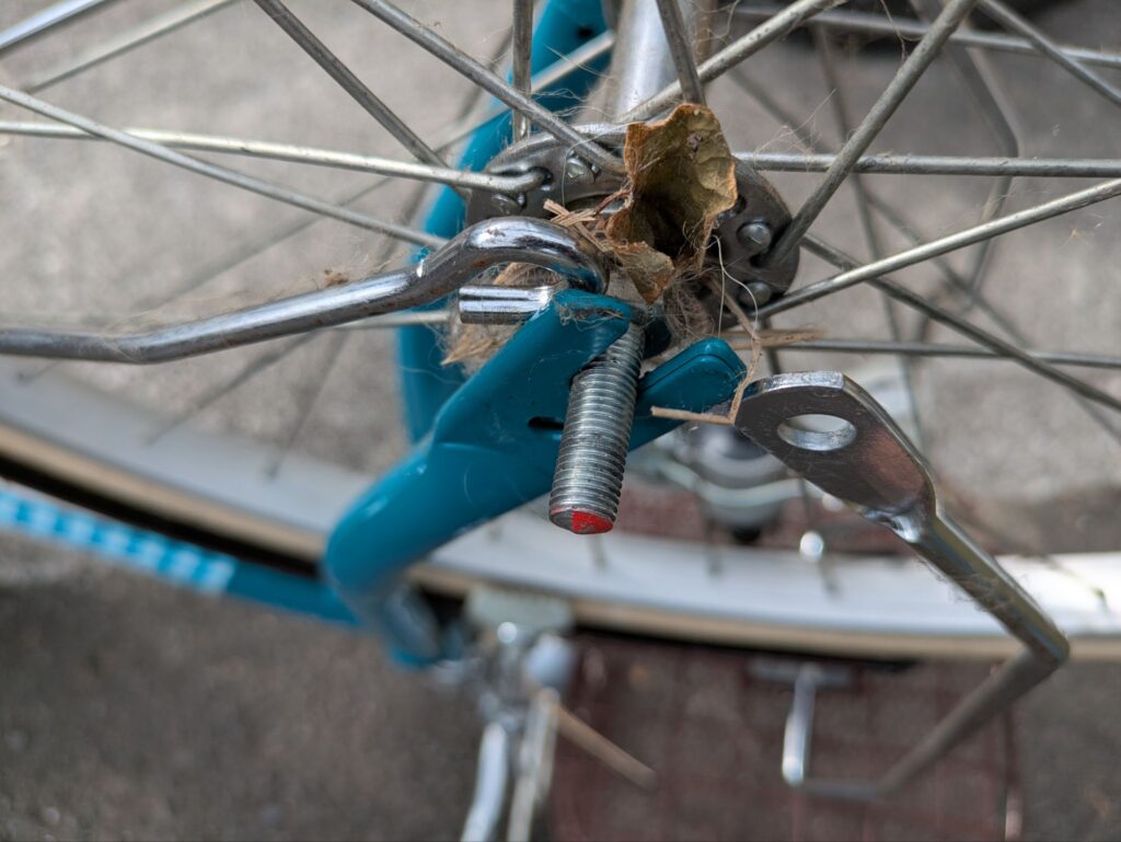 タイヤを完全に外す前に写真をとっておき、泥除け・カゴ・ナットがどの順番で組付けられているのか記録しておくと組む時に役に立ちます。