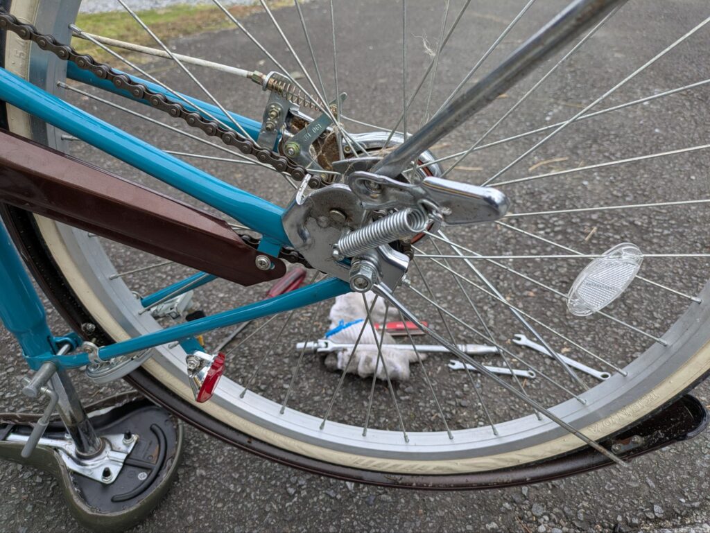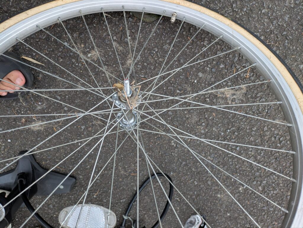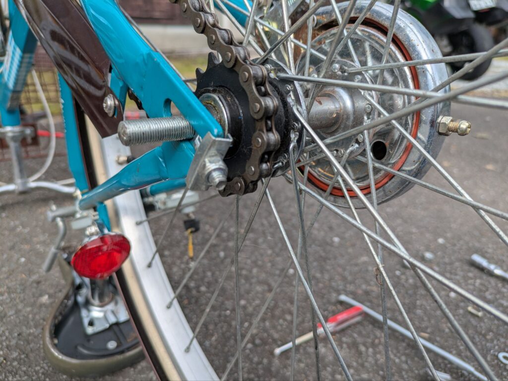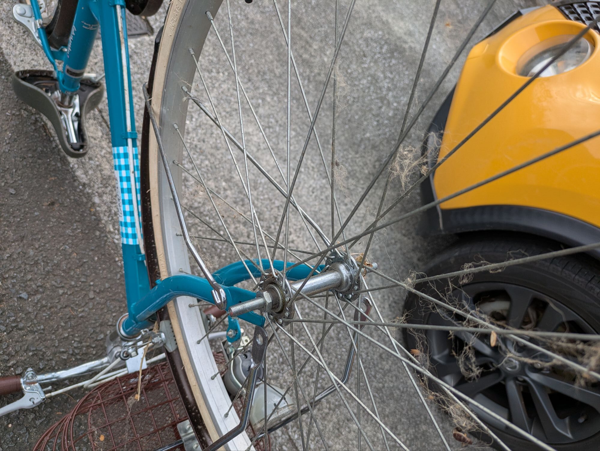 タイヤを完全に外す前に写真をとっておき、泥除け・カゴ・ナットがどの順番で組付けられているのか記録しておくと組む時に役に立ちます。