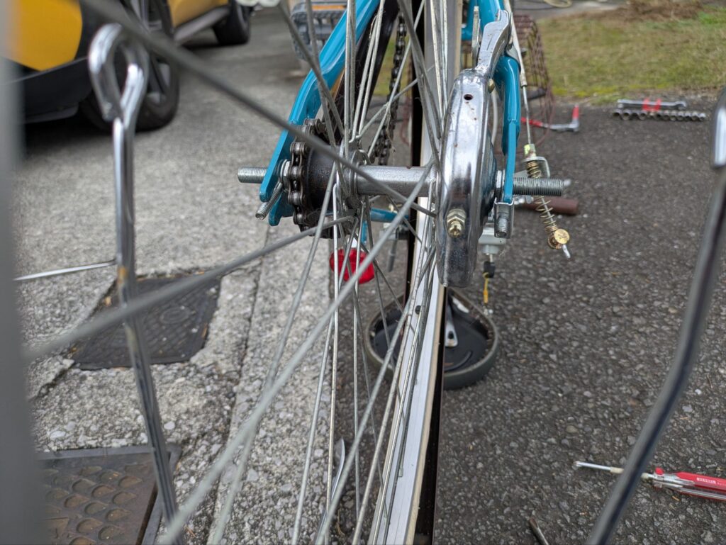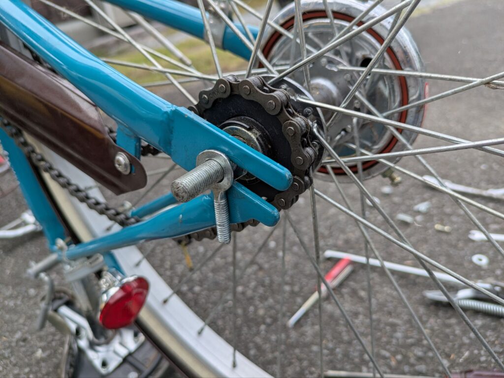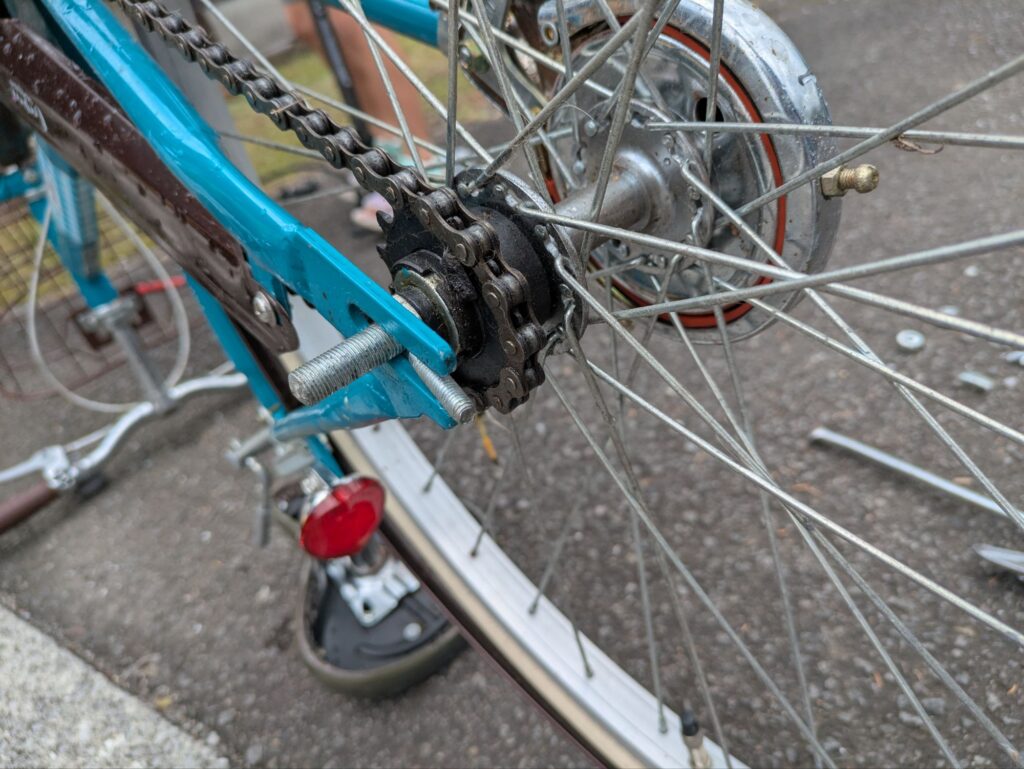 フレームの先端にチェーン調整用のナットがついていますが、そちらを外してリアタイヤが外せる状態にします。