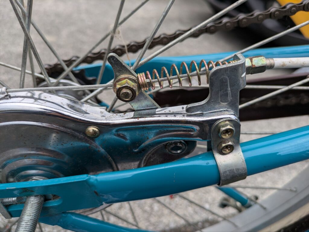 ドラムブレーキとフレームを繋いでいるボルトを全部外せば、リアホイールが外せるようになります。