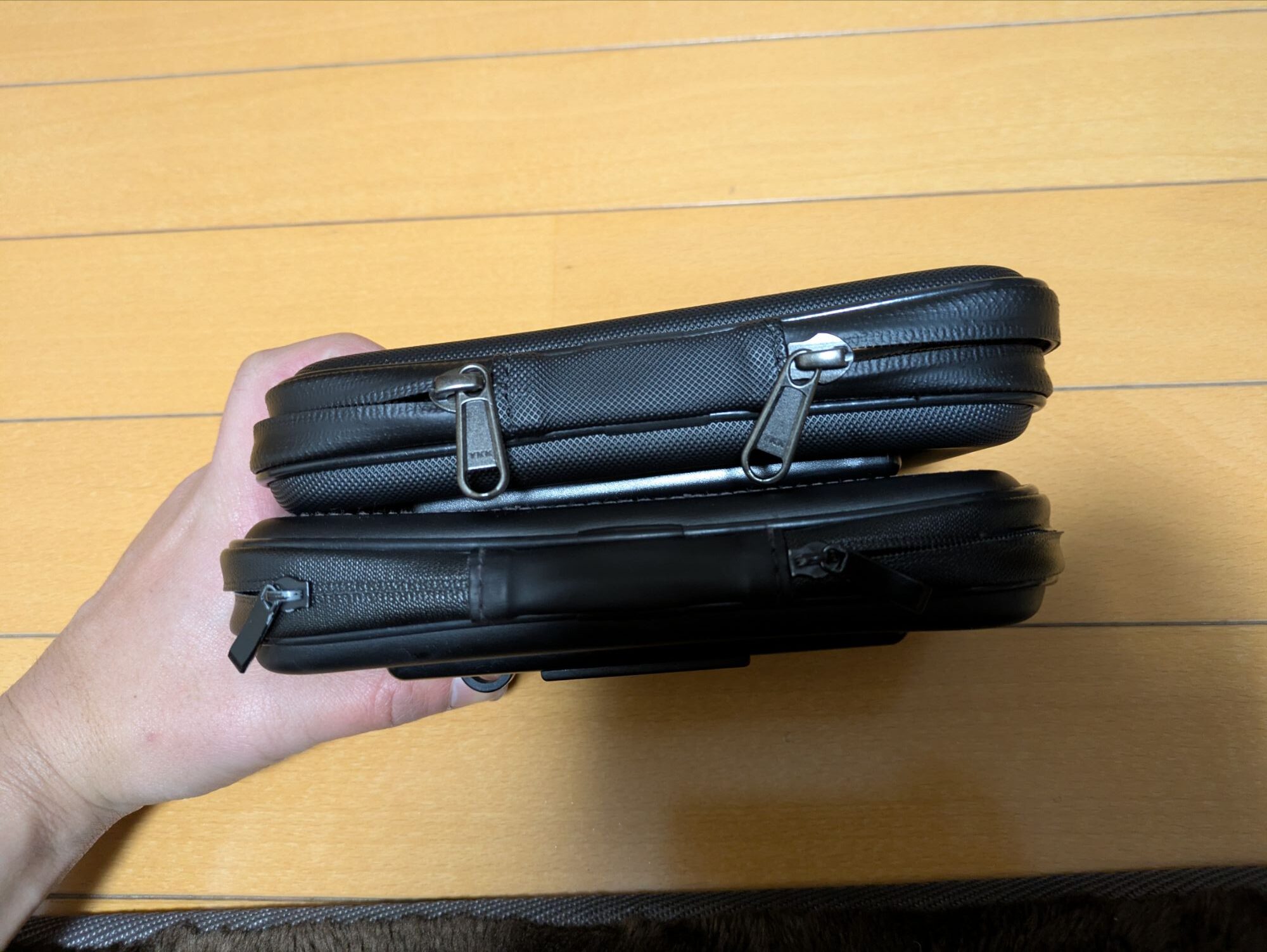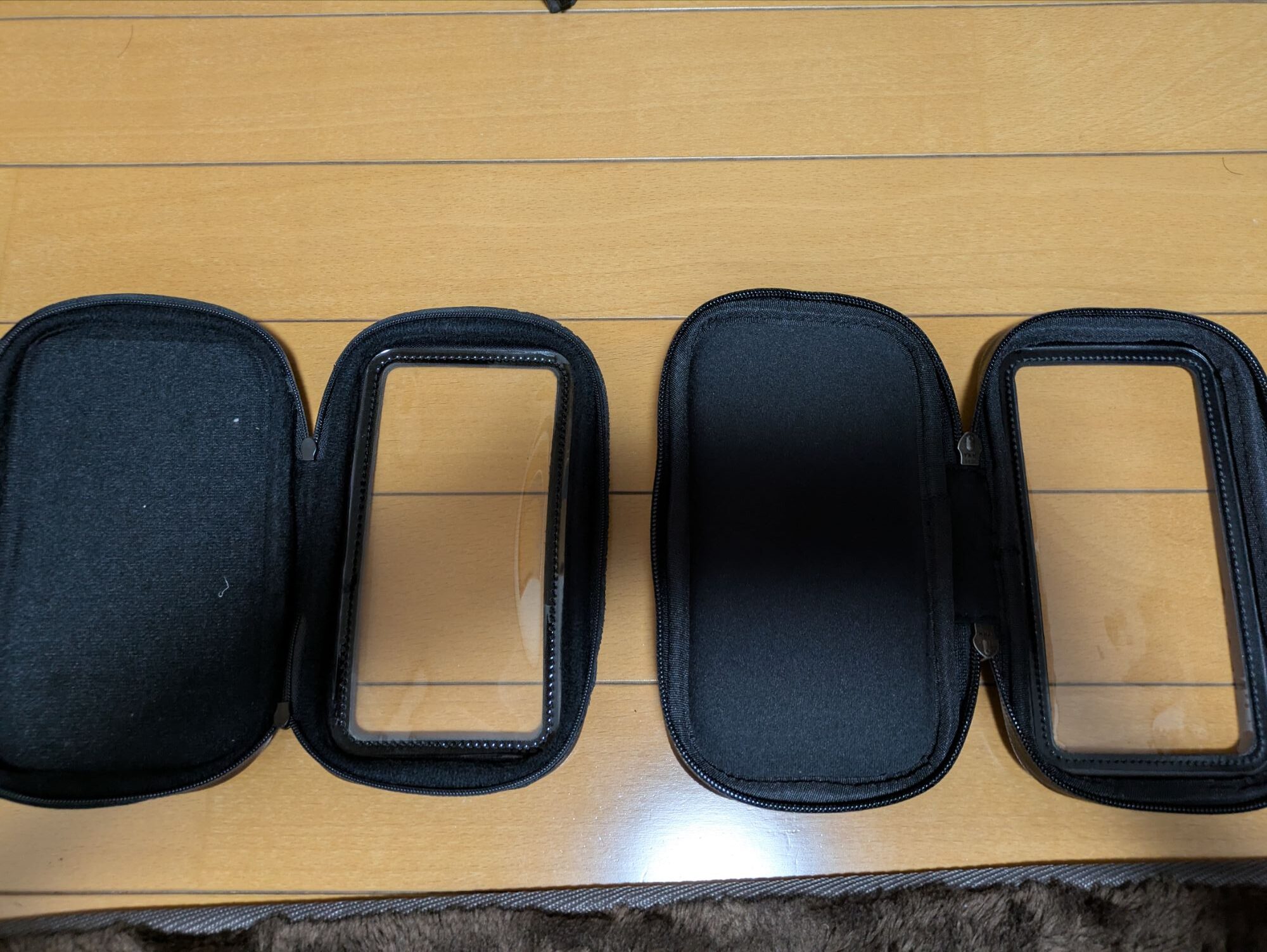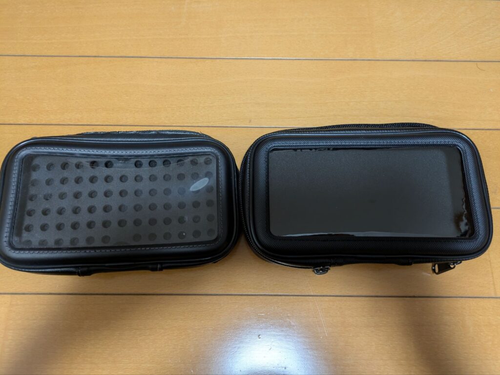 今まで使っていたスマホホルダーと新品を比較した写真になります。ファスナー部分の合皮のくたびれ具合が分かりやすいです。