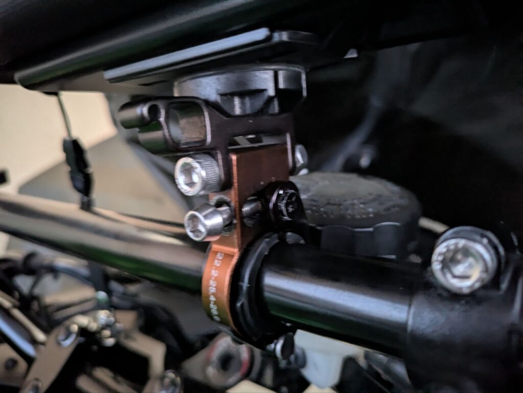 最後にスマホホルダーをバイクに取り付けます。デイトナのスマホホルダーは複数のバイクのハンドルに合うよう、ゴムを何枚か用意しています。自分のバイクハンドルの径に合わせて調整してください。