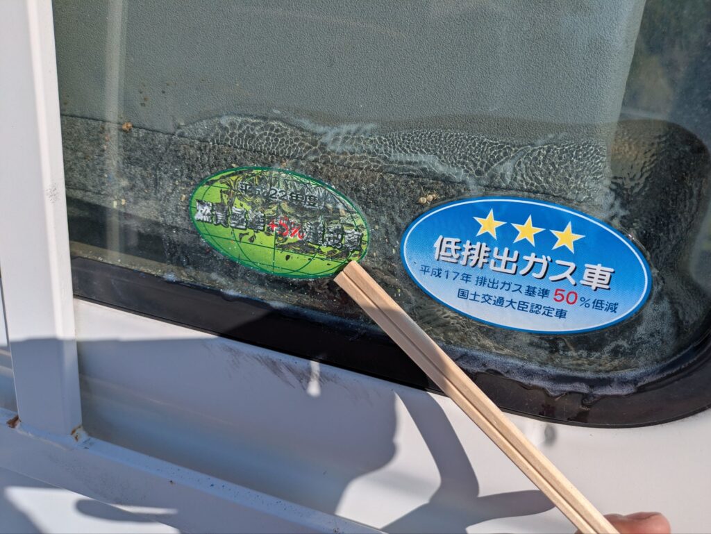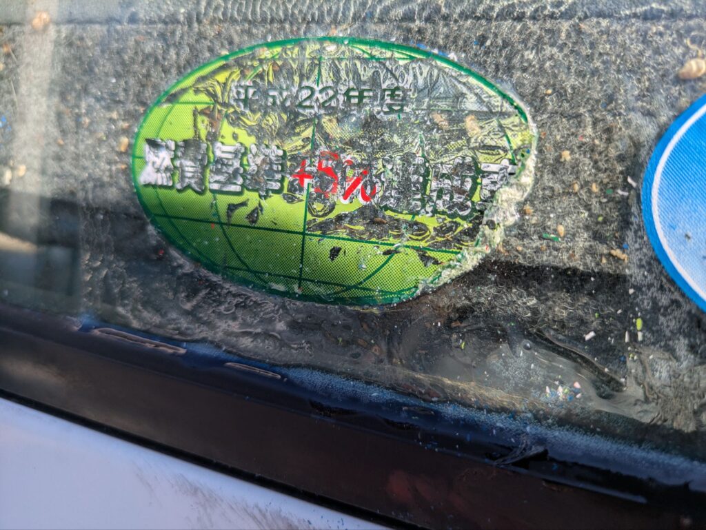 写真の通りかなりボロボロになっており、見た目も悪くなっています。今回ステッカーを剥がそうと思った理由も燃費基準のステッカーがボロボロになっているのが見えたからです。