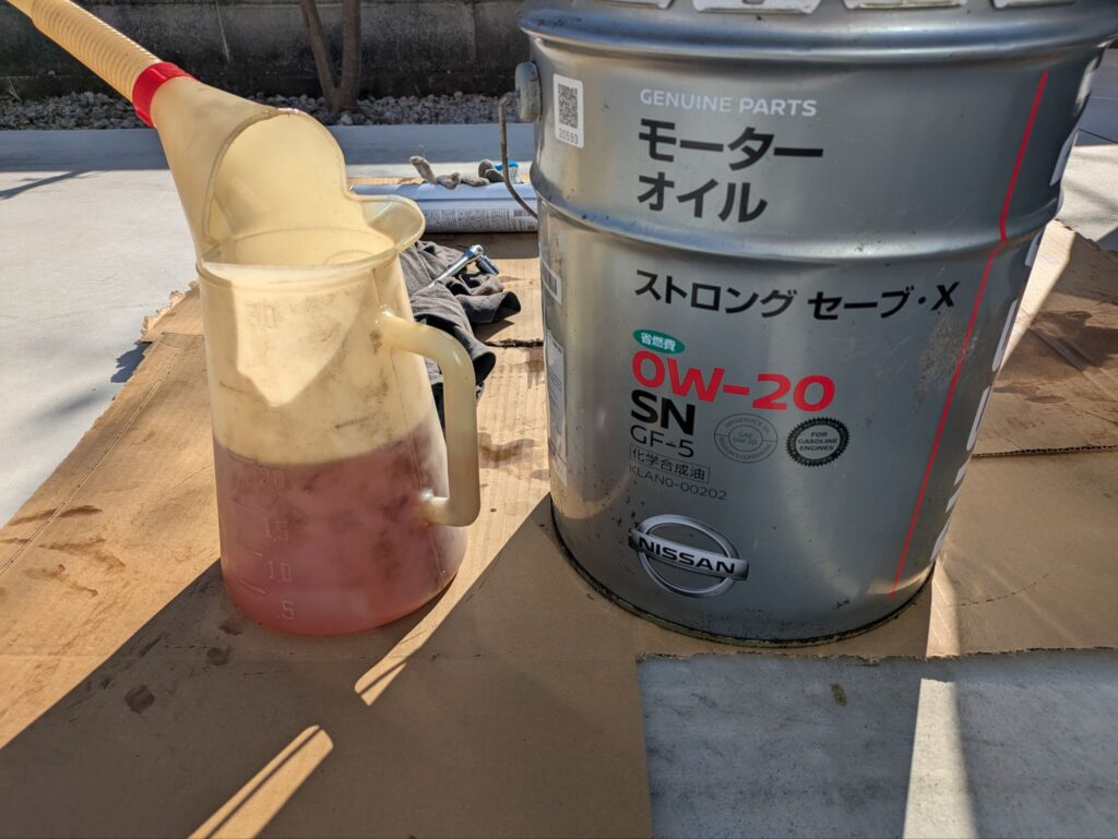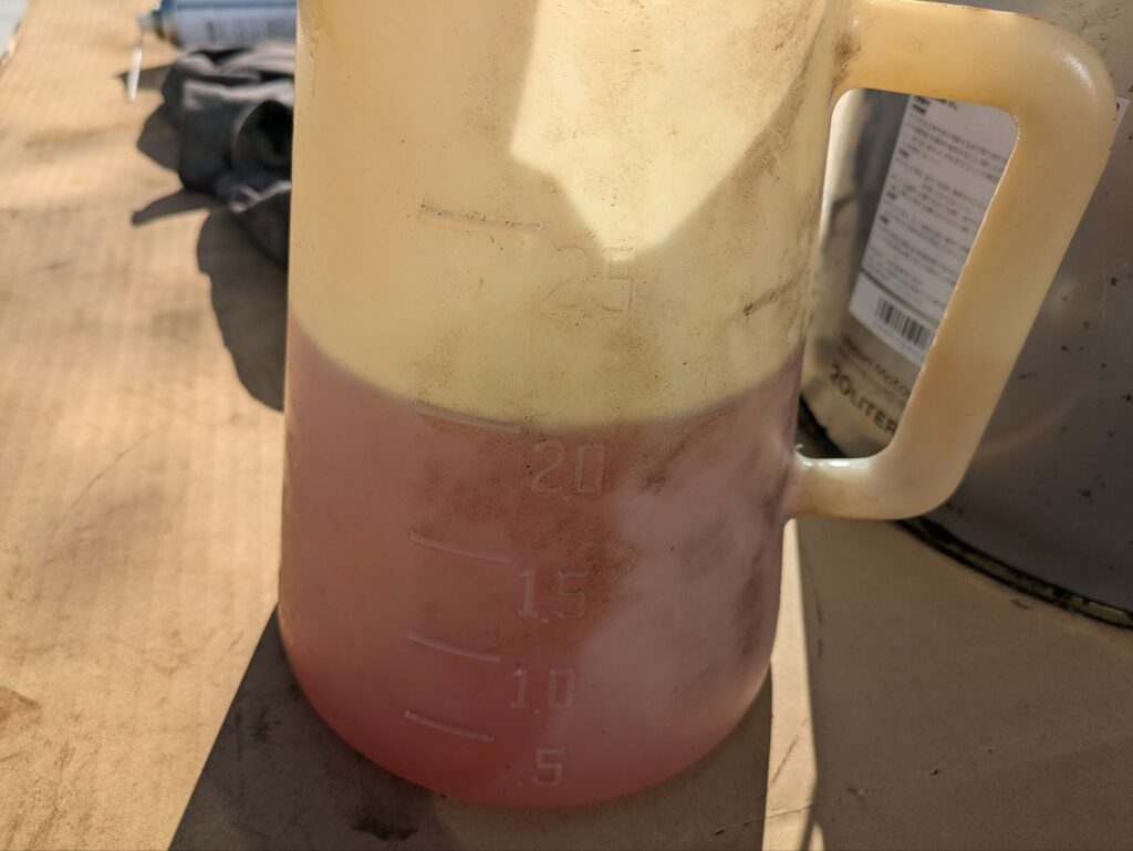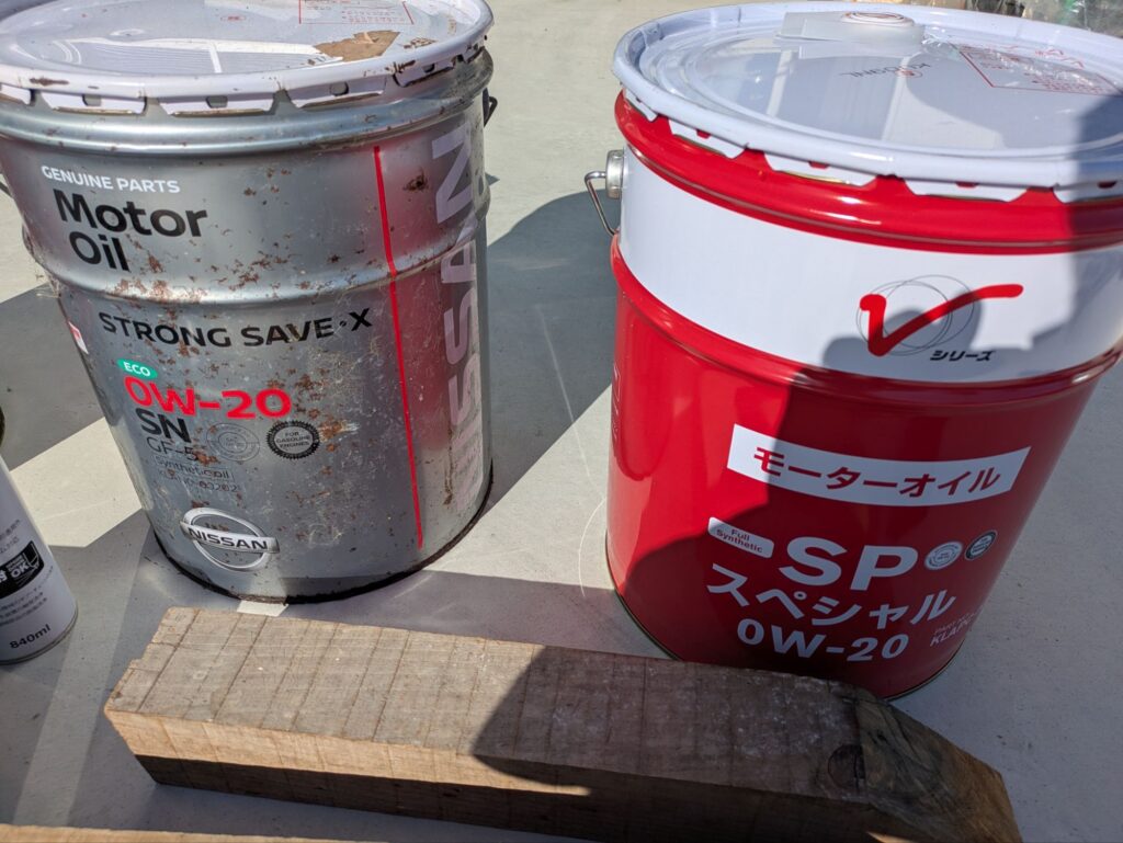 古いペール缶ではオイルが足りなかったので追加でオイルを入れます。粘度も一緒なので混ぜてどうにかなることはないですが、気になる方は混ぜずに新しいオイルを使いましょう。