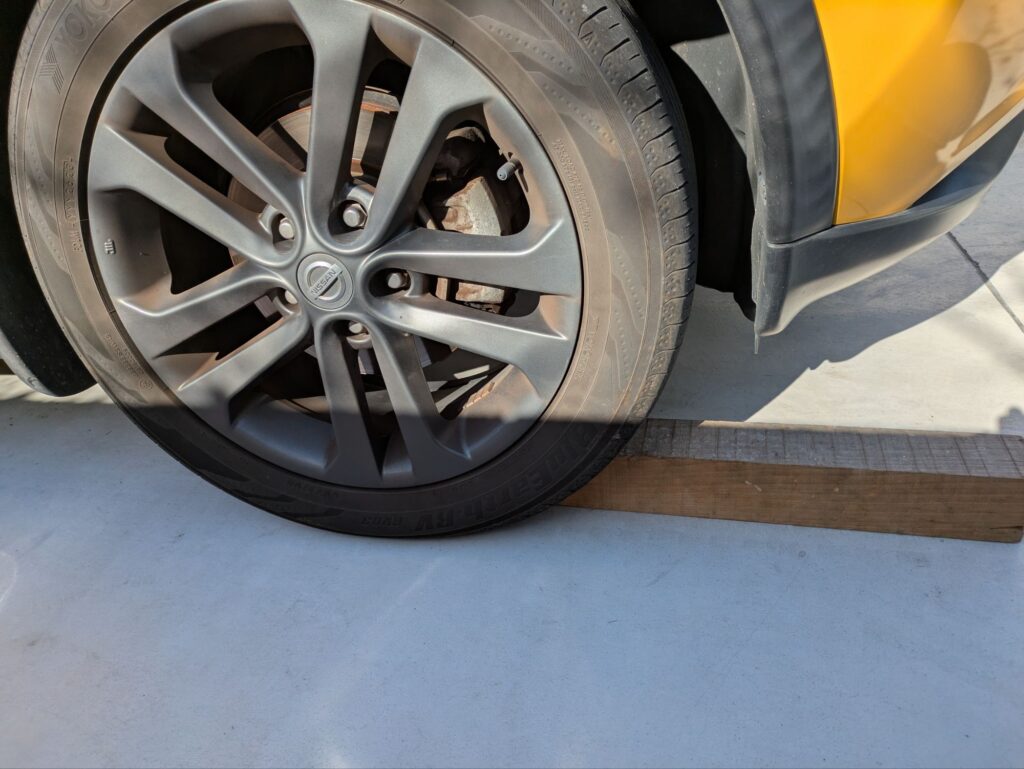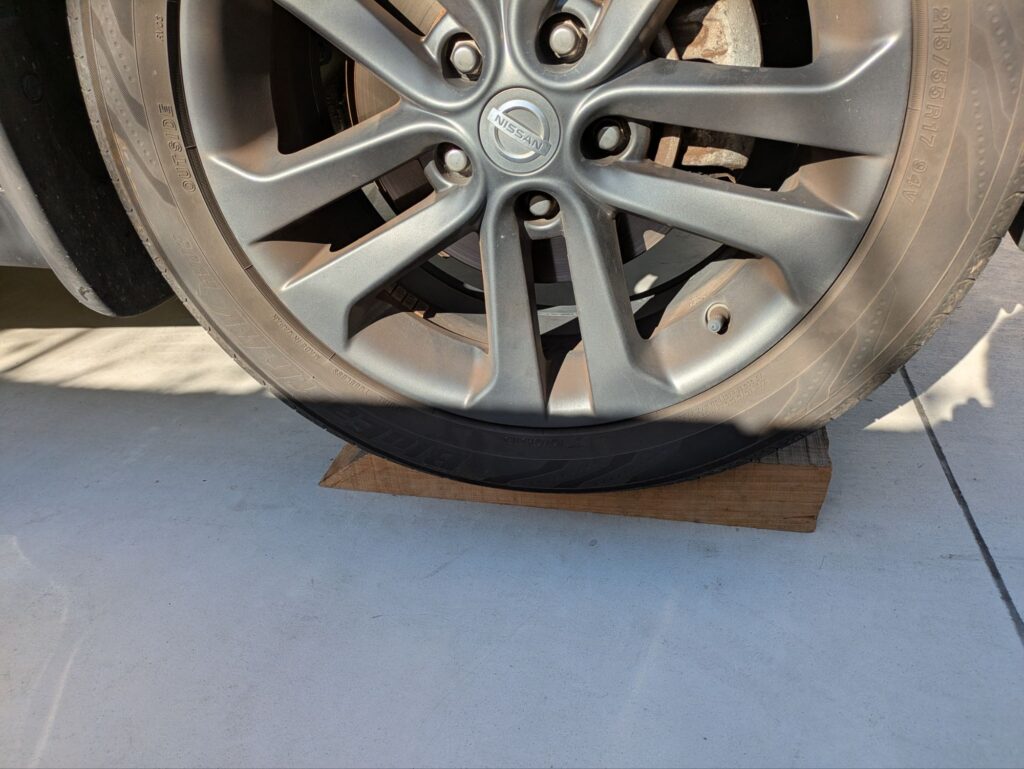 実家で使用しているニッサン・ジューク(が、前回のエンジンオイル交換から5000kmを超えてエンジンオイル交換の時期になりました。前回使用した木のスロープを使用するとジャッキアップの必要が無く楽にオイル交換できるのが分かったので、今回もスロープを使ったオイル交換をします。