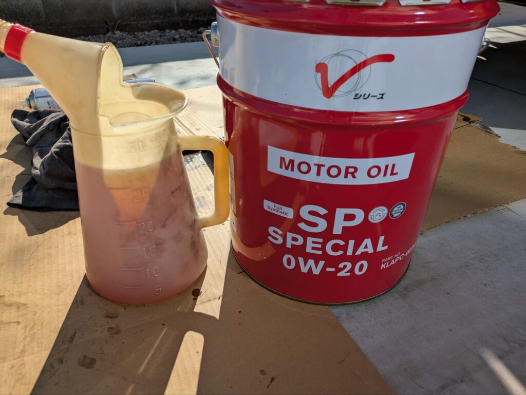ドレンボルトを締めたら新しいオイルを入れる準備をします。最初にオイルジョッキに規定量のオイルを入れます。今回はオイル交換の実なので2.8L入れます