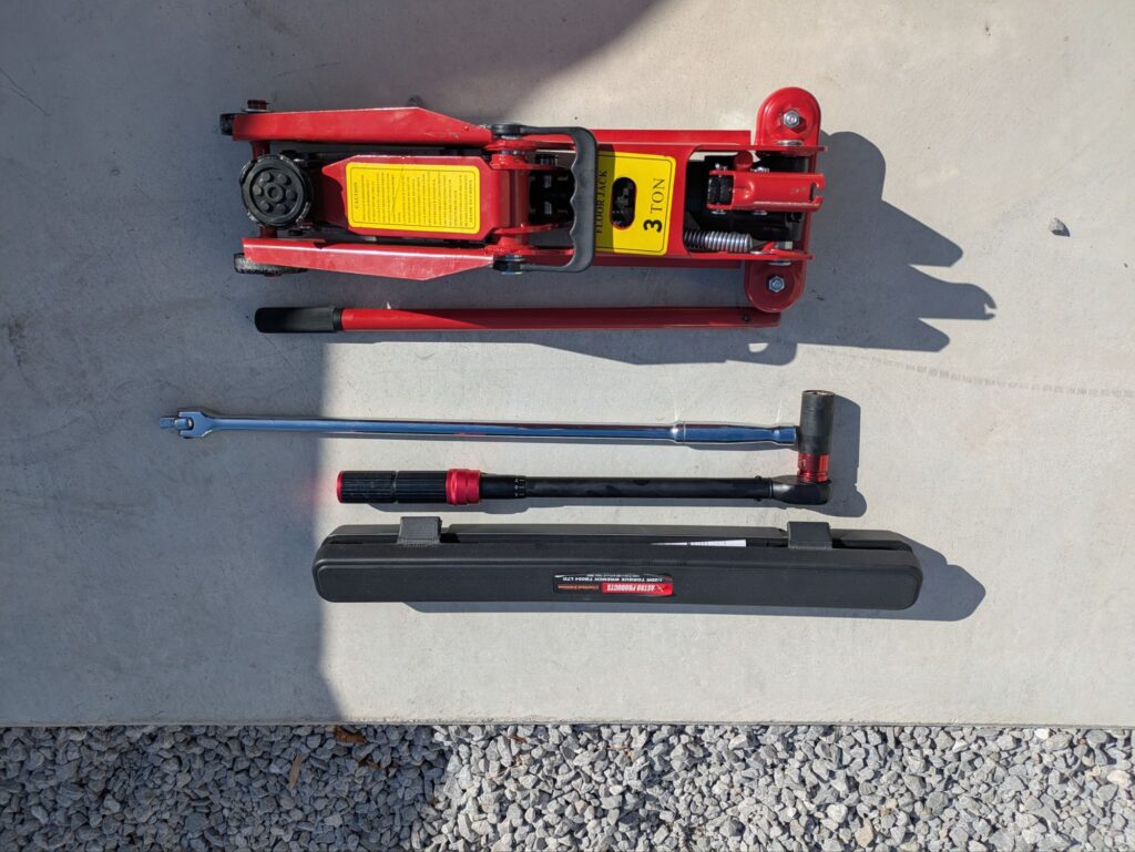 スタッドレスタイヤの交換を行うのに必要な工具を並べてみました。