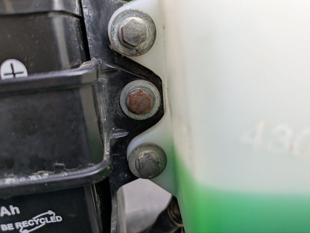カウルを外すとバッテリーが現れます。バッテリーはプラスチックのステーで固定されているので先にステーを外します。