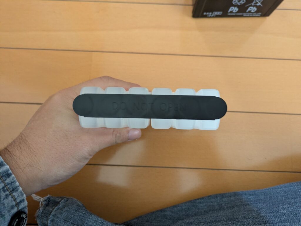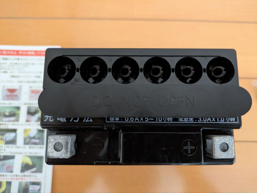 電解液の入っていたボトルについていたDO NOT OPENのふたをバッテリーに取り付けます。