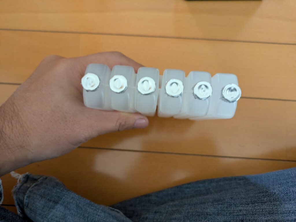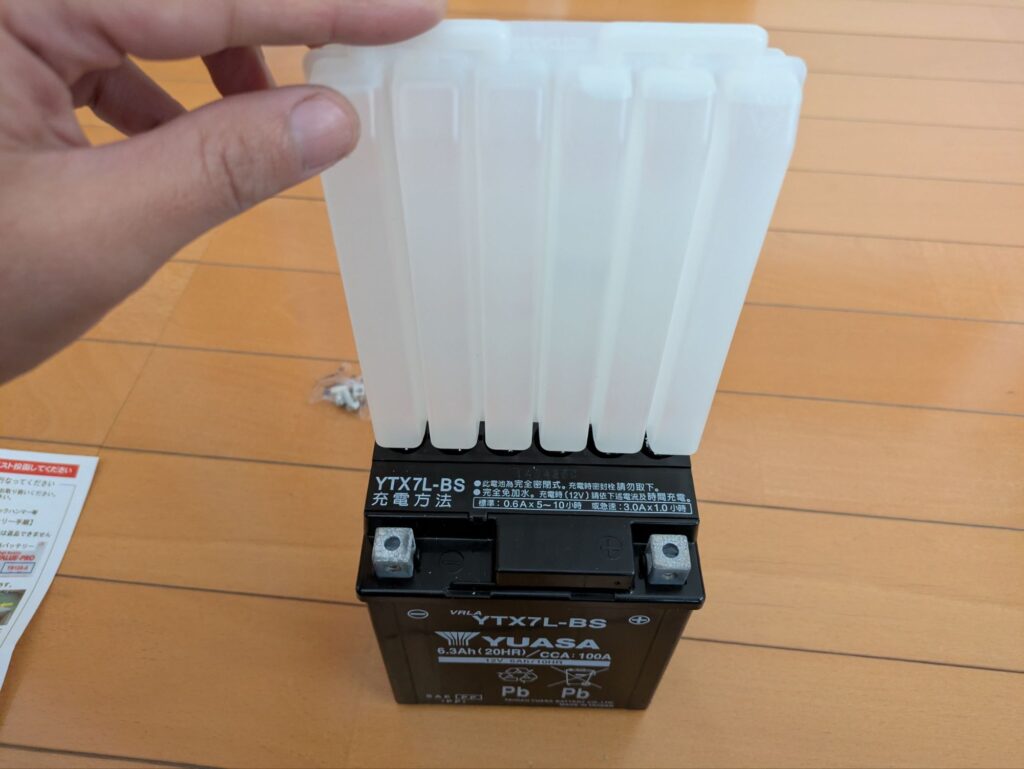 付属している電解液をバッテリーに入れるため、ふたを外します。