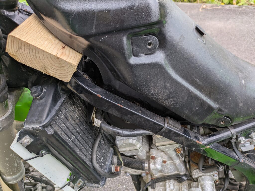 タンクをずらす際、2×4材を挟んであげてタンクを上げるとプラグ交換時の工具を入れる隙間ができるのでオススメです。