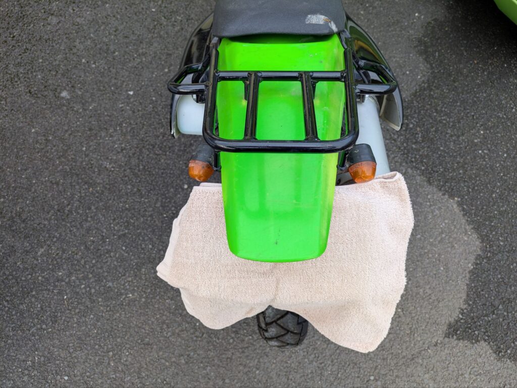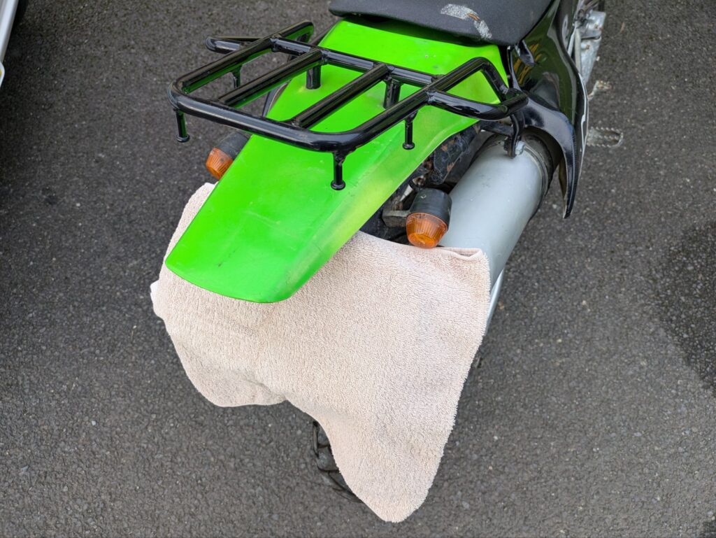 今回は実家で眠らせていたKLX250をオフロードコースで走らせるためにリアキャリアを外していきたいと思います。