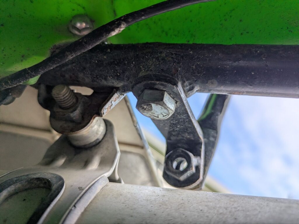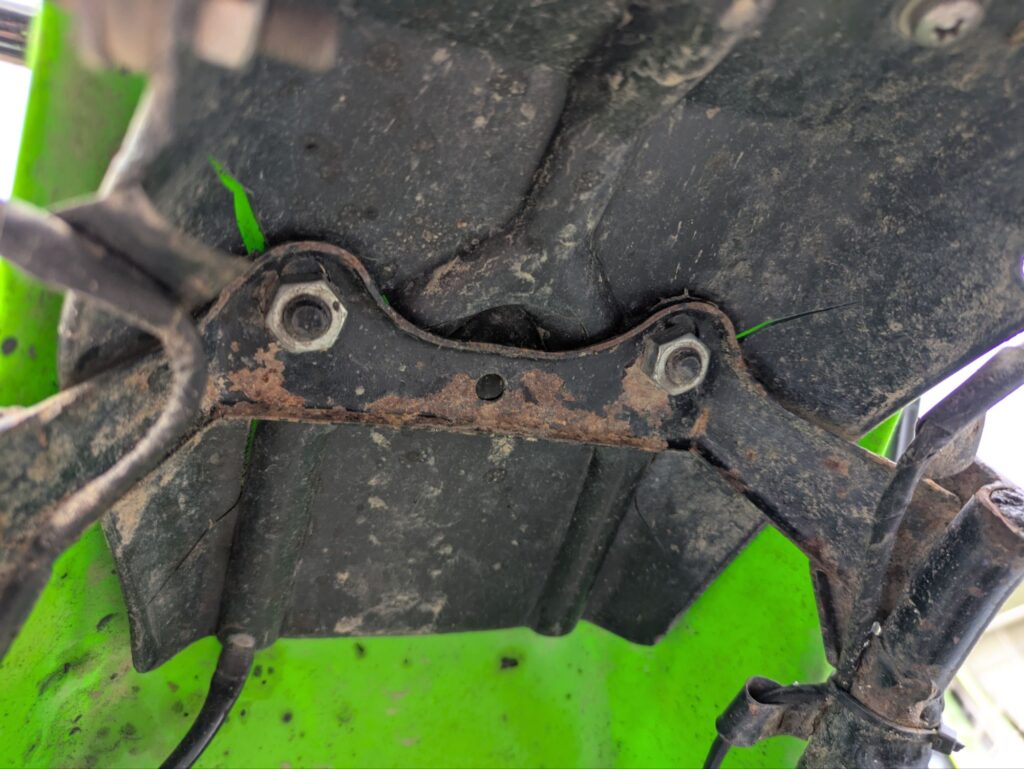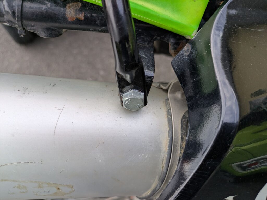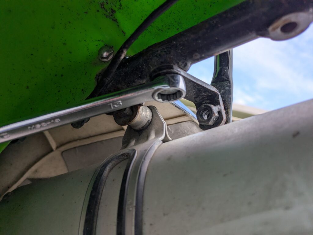 右下の固定部分はマフラーが邪魔でソケットが入らないため、メガネレンチを使って外します。