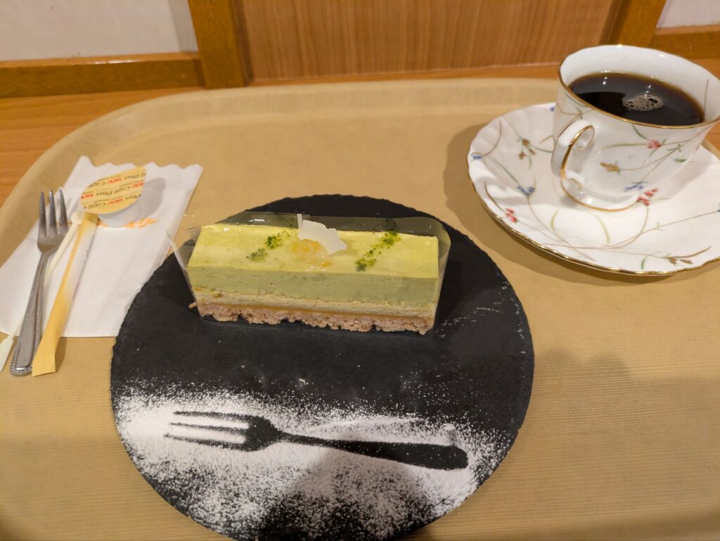 ピスタチオのケーキ。おしゃれなケーキも食べられるとは、船すごい。
