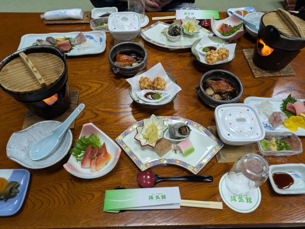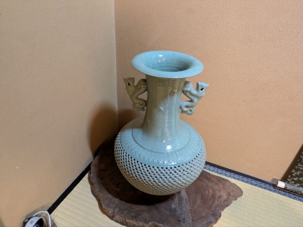 宿の風景。部屋には立派な壺が置かれてました。壺を飾るという余裕があるって素晴らしいことや。いつも買ってる砥部焼とは色も作りも違って芸術を感じます。