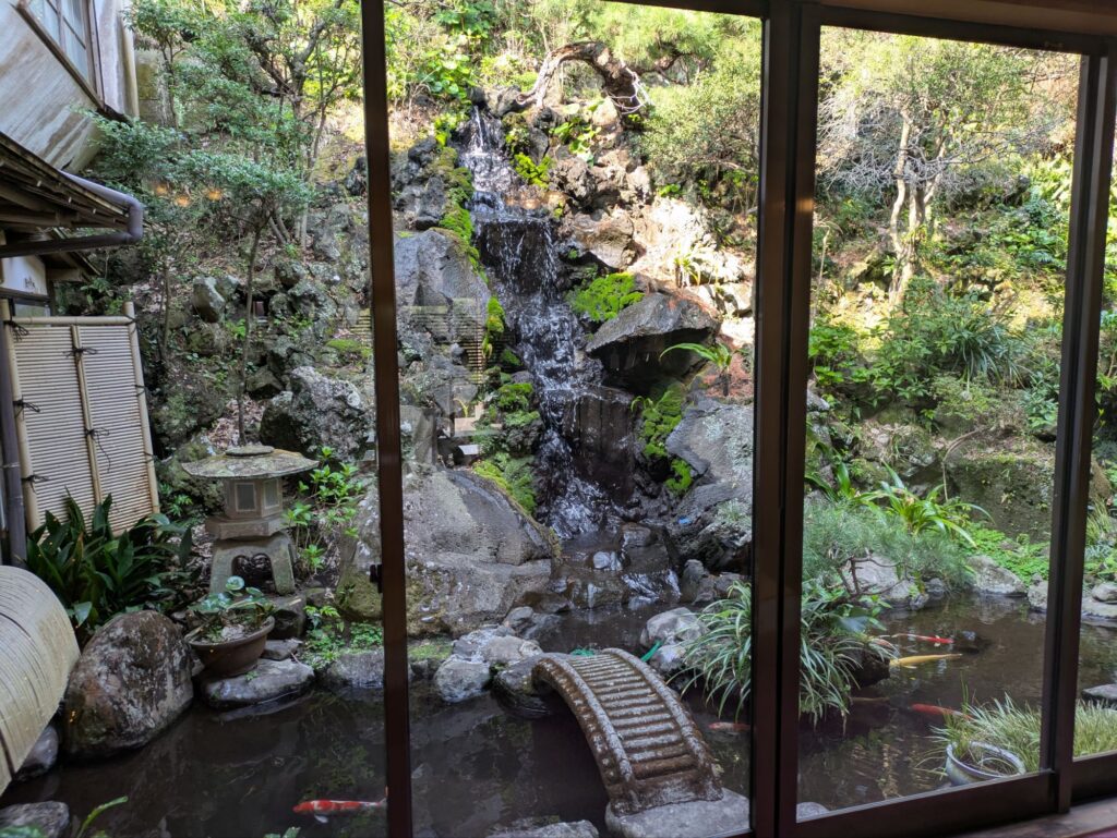 こう改めて写真で見ると室内から岩肌を流れる水と鯉を眺められるって日本だなと思う。全面ガラスで風景を切り取ったみたいで美しい。やはり旅館。