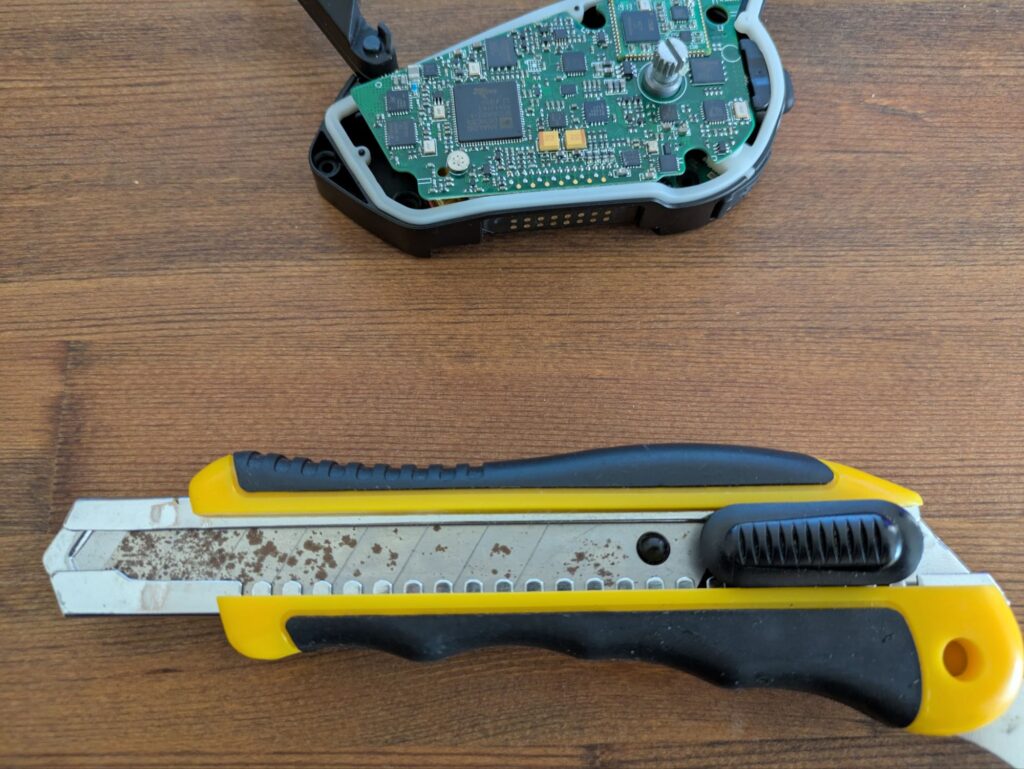 精密ドライバーのマイナスや、ヘラでこじっている人が多いですが、手持ちの道具が無かったのでカッターでこじりました。