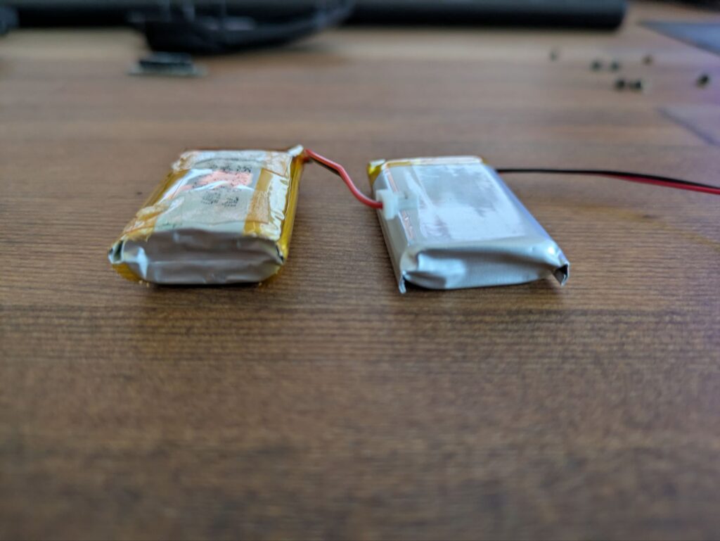 厚みを比較すると歴然、左の使い込んだバッテリーは膨れ上がっています。