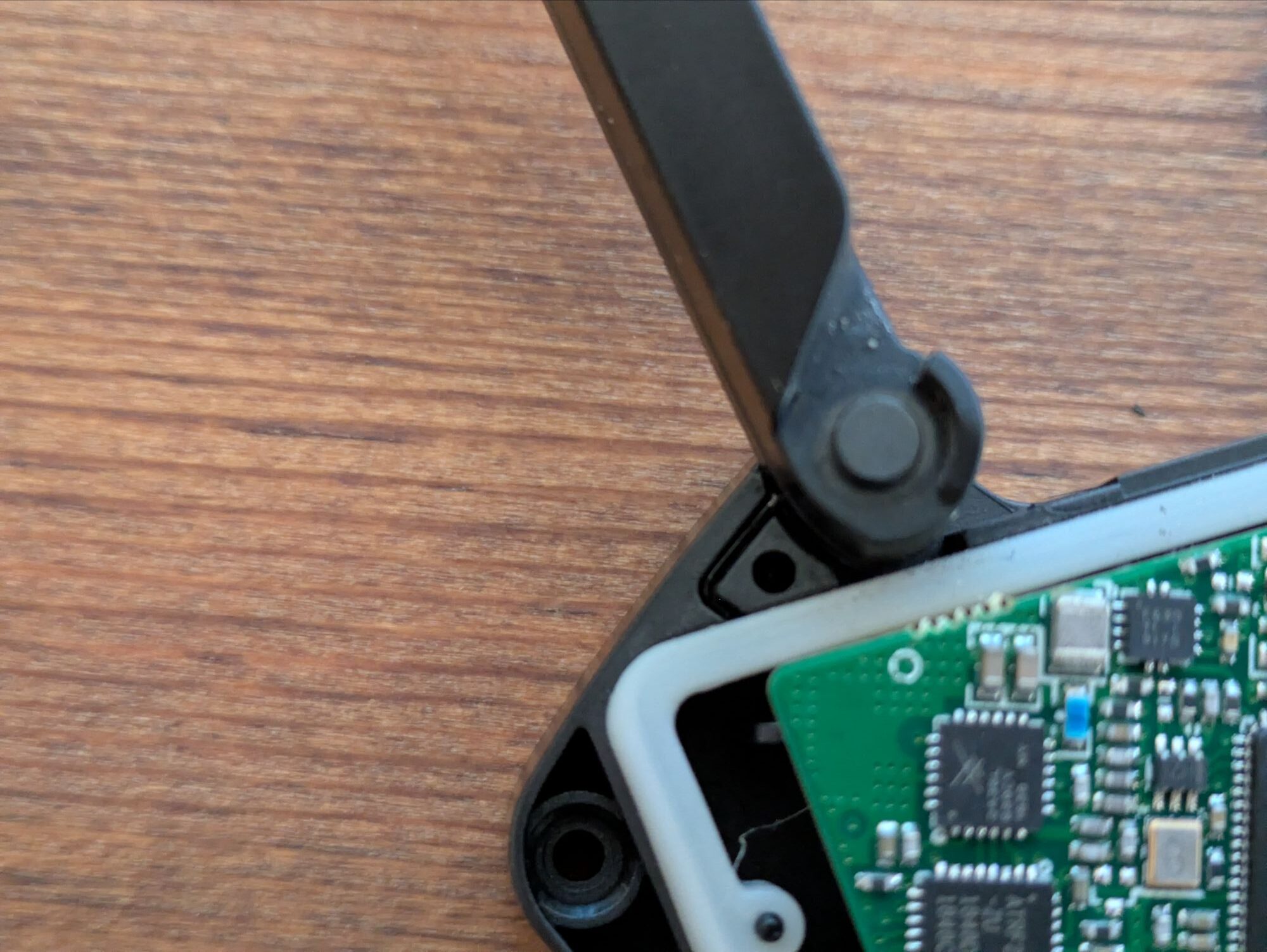 アンテナ部分にバネがついていますが、バネの先端のL字形状と同じ溝がカバーに彫られているので、合うように入れておきます。