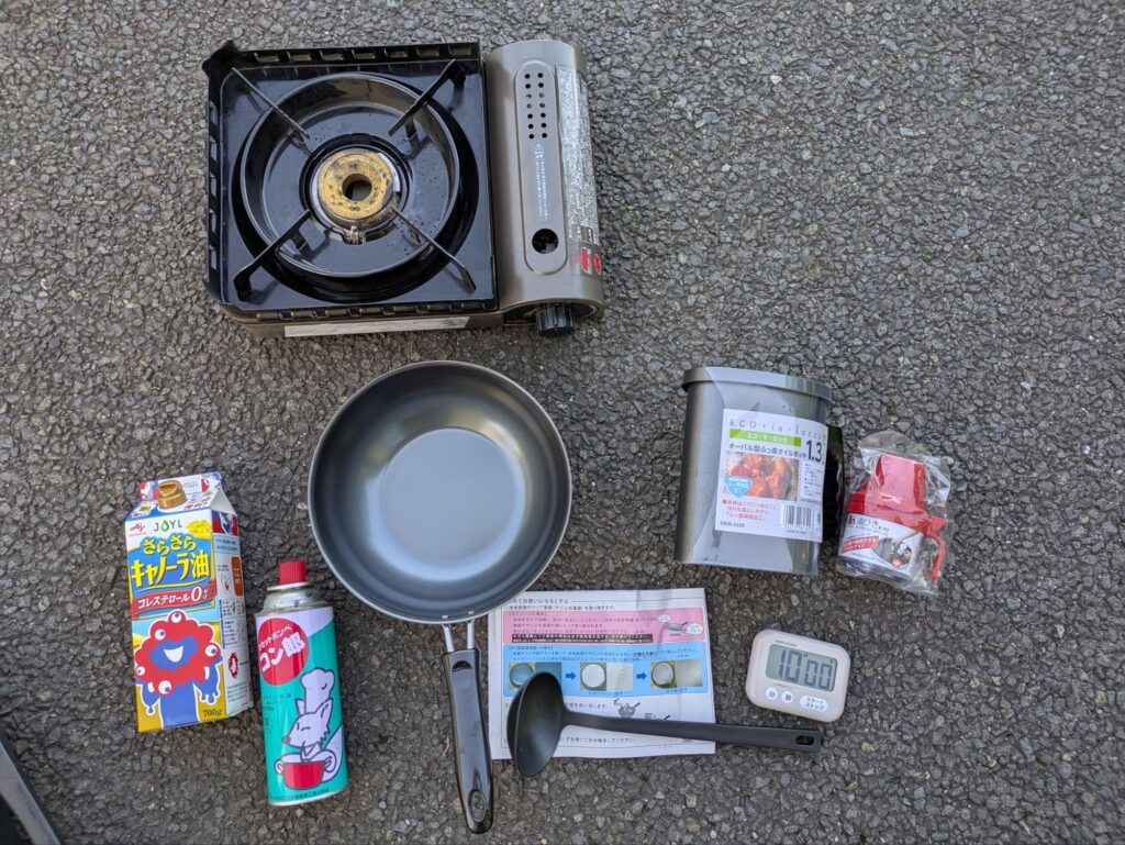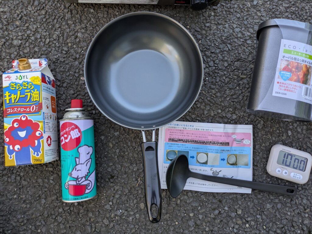 油でコーテイングする際、お玉一杯分くらいが目安になるので、用意します。 - ストップウォッチ