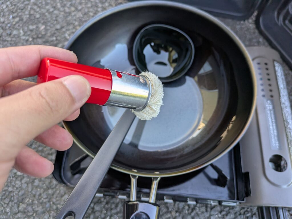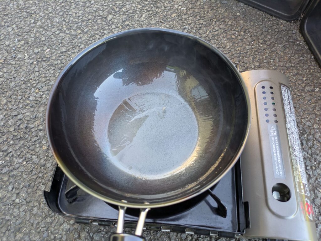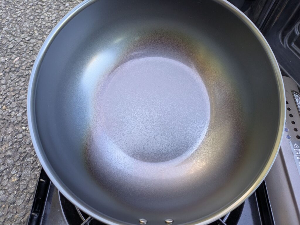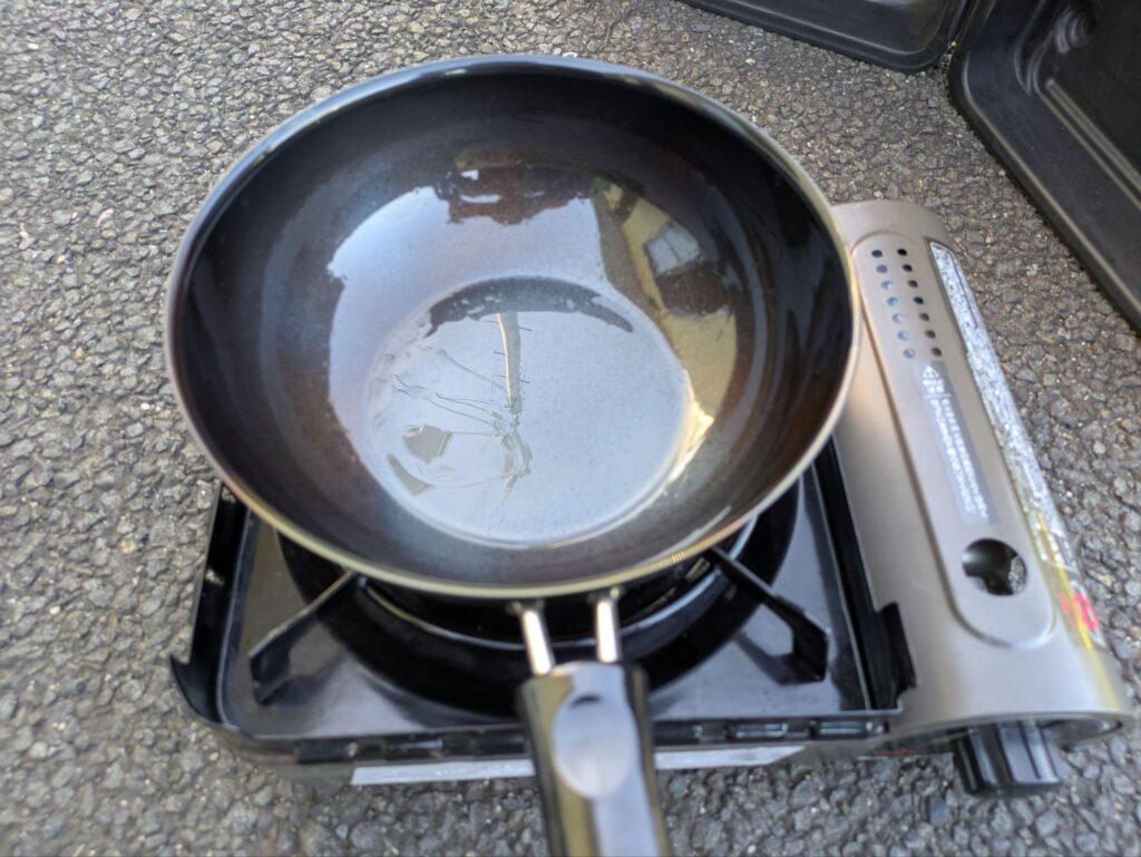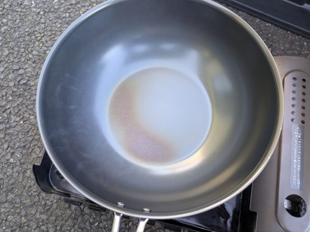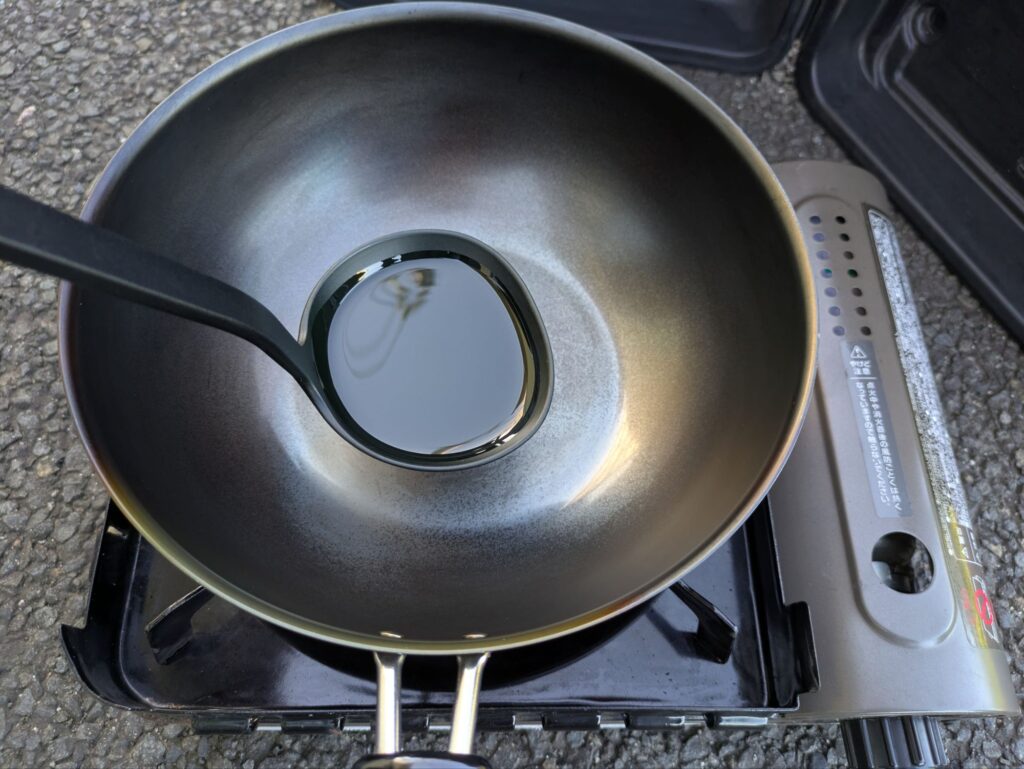 - 多めの油を注ぎ、加熱して油を本体になじませる(お玉1杯分)