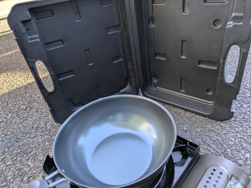 カセットコンロが入っているケースを風よけにします。